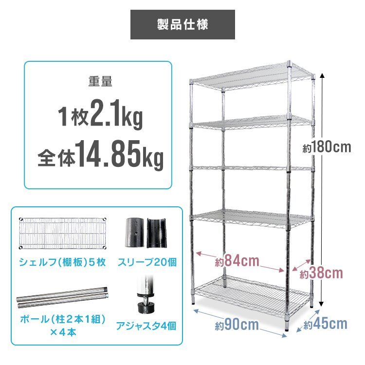 どんなお部屋にも合わせやすいスチールラックです。 ぐらつき防止アジャスター付き! クギやネジを使わずに簡単に組み立て出来ます! 棚の高さを自由に変えることができます。 一人暮らしのお部屋やリビング、キッチン、物置など場所を問わず活躍できます。 アパレルショップの店頭用やオフィスにも使用されています。 【仕様】 サイズ(約):幅90×奥行45×高さ180cm 耐荷重(約):(全体)375kg / (棚板1枚あたり)75kg 材質:スチール(クロームメッキ)、ABS樹脂他 重量(約):14.9kg カラー:シルバー 【商品内容】 シェルフ(棚板) ×5 ポール(ジョイント式) ×4 棚板固定部品 ×20 標準アジャスター(固定足) ×4 |