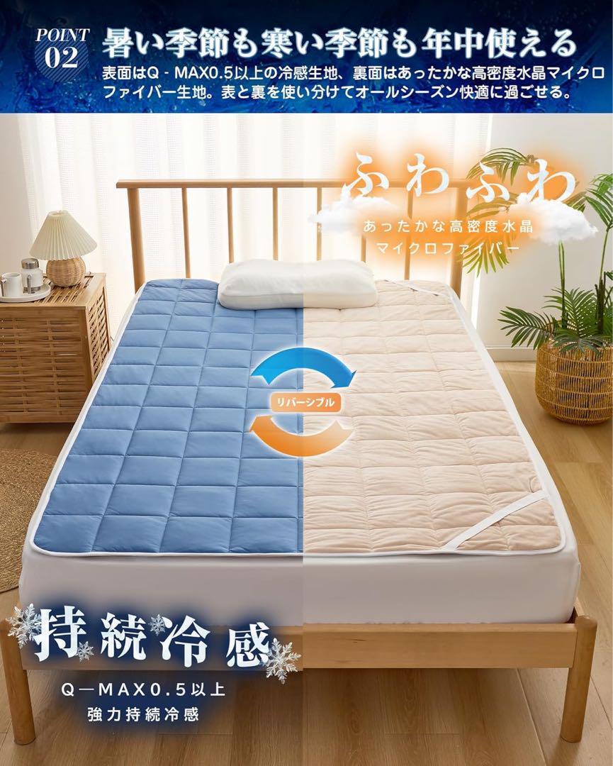 春夏シリーズと秋冬シリーズを組み合わせ、さらに革新的な素材を利用した高級敷きパッドが登場!表面はQ‐MAX0.5以上の冷感生地、裏面はあったかな高密度水晶マイクロファイバー生地。2層のシートを使って、冷感側は下の熱気を切って、マイクロファイバー側で寝る時寒気を切ります。年中快適にご利用できます。また春や秋の、一日違うだけで気温が違うという極端な変化が起こりがちな気候だと、裏表ひっくり返すだけでいいので日によっては非常に便利です。