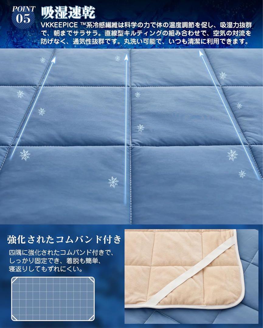 冷感繊維は科学の力で体の温度調節を促し、吸湿力抜群で、朝までサラサラ。直線型キルティングの組み合わせで空気の対流を防げなく通気性抜群です。丸洗い可能でいつも清潔に利用できます。四隅に強化されたコムバンド付きで、しっかり固定でき着脱も簡単、寝返りしてもずれにくい。
