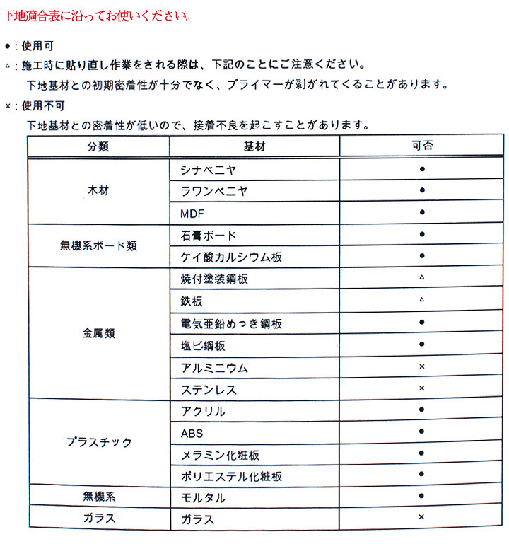 耐熱性・耐可塑剤性・耐アルカリ性に優れています。ダイノック フィルムを重ね貼りするとき、また、塩ビ鋼板・プラスチック(ポリエチレン、ポリプロピレン、フッ素樹脂は除く)モルタル・石綿ストレート・木材などに貼るときに効果を発揮します。