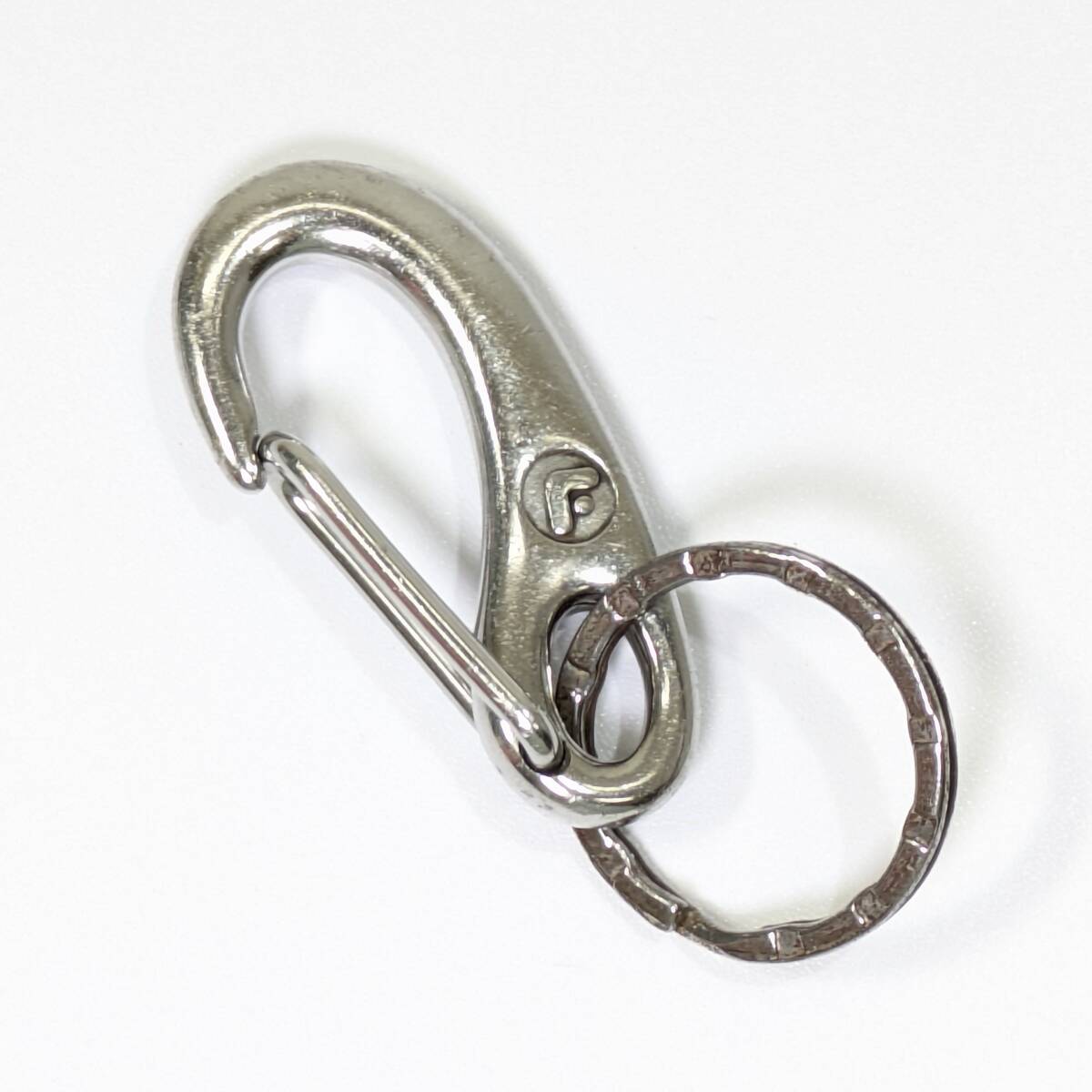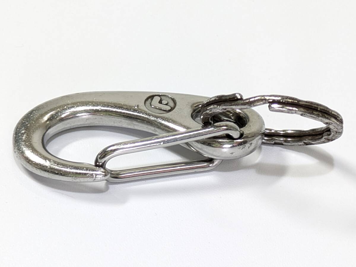 丈夫で重厚なステンレススチールの美しいフォルムのカラビナに、キーリングとして使えるダブルリングが付属しています。