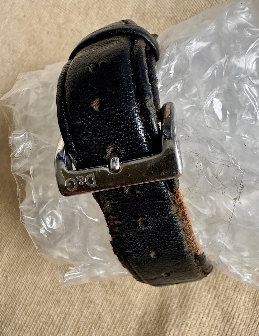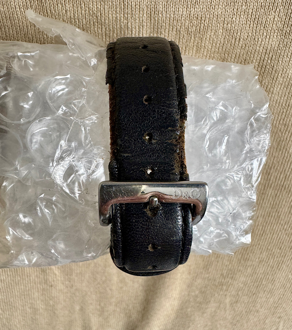 シルバーの文字盤とブラックレザーのベルトを持つD&Gのクォーツ腕時計。日付表示機能付き。