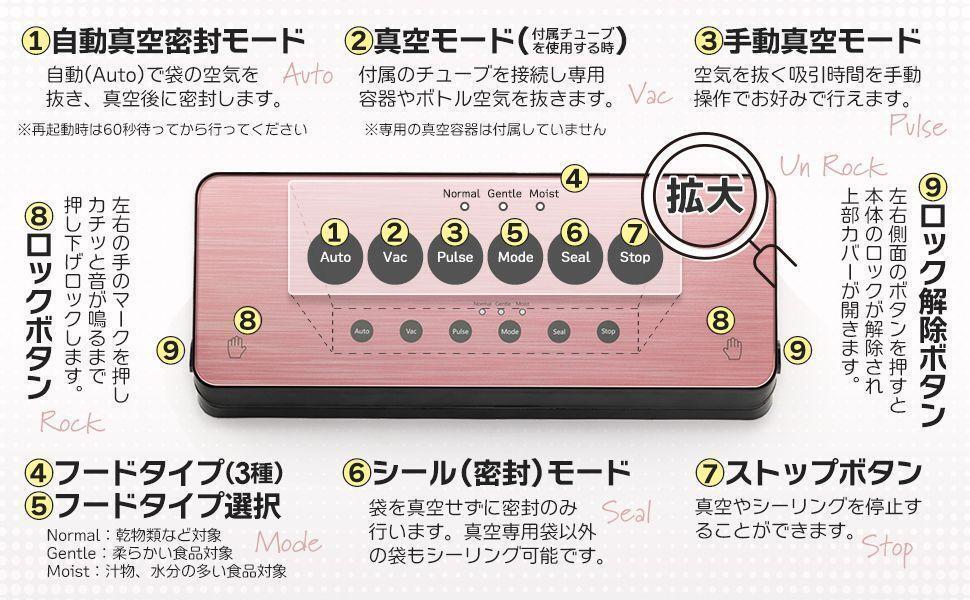 その他手動真空、密閉(シール)のみ、付属のチューブを使用した真空モード(※真空専用チューブに対応している容器やボトル・瓶のストッパーを使用してください)が搭載されています。