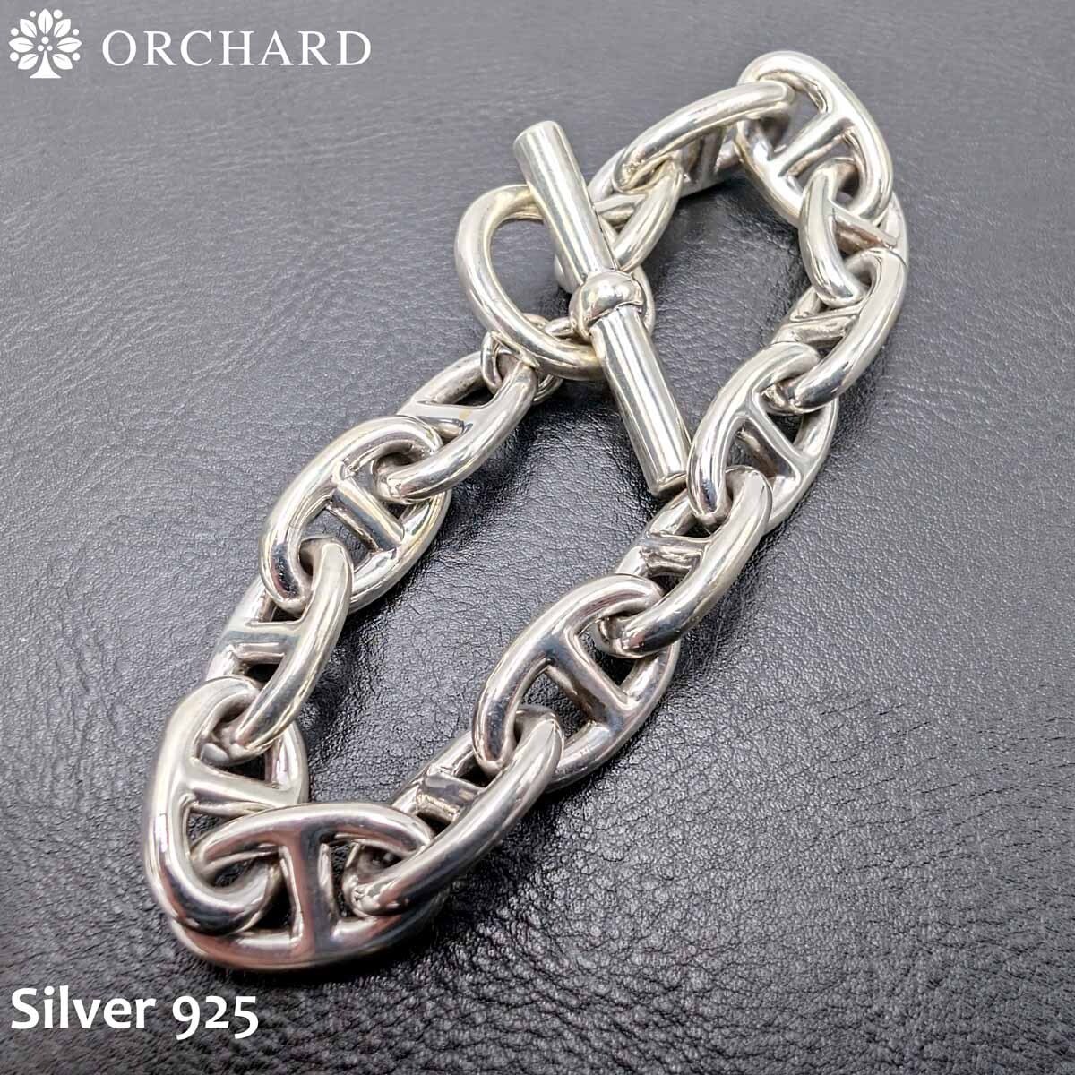 シルバー925製のアンカーチェーンミドルサイズブレスレットです。重厚感のあるアンカーチェーンデザインが特徴で、シンプルながらも存在感を放つ一品です。カジュアルなスタイルにもフォーマルなスタイルにも合わせやすく、手首をエレガントに飾ります。高品質なシルバー925を使用しており、長く愛用いただけるアイテムです。