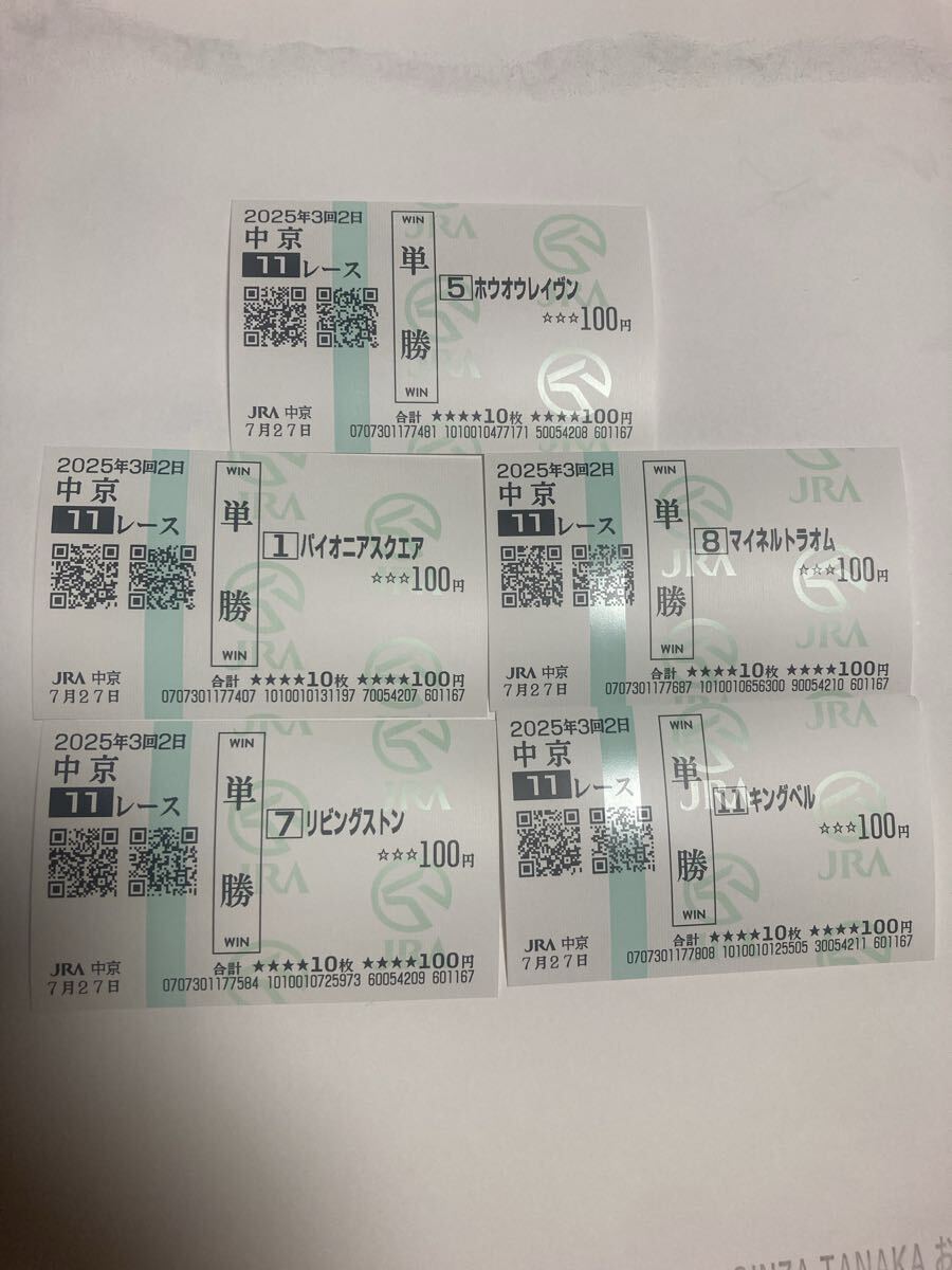 2025年7月27日(日)に中京競馬場で開催された 中京 3歳未勝利 ホウオウレイヴン を含む現地単勝馬券 計5枚 です。