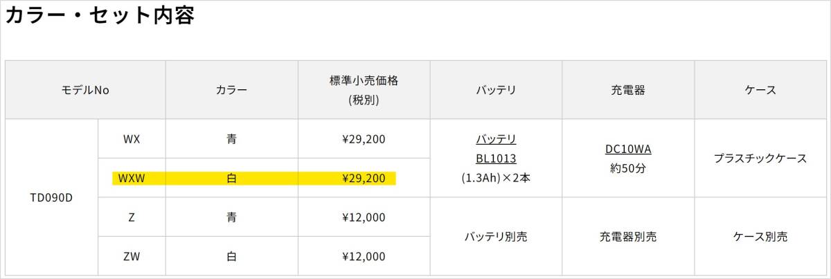 ・本体、10.8V-1.3Ahバッテリ:BL1013x2個、充電器:DC10WA、