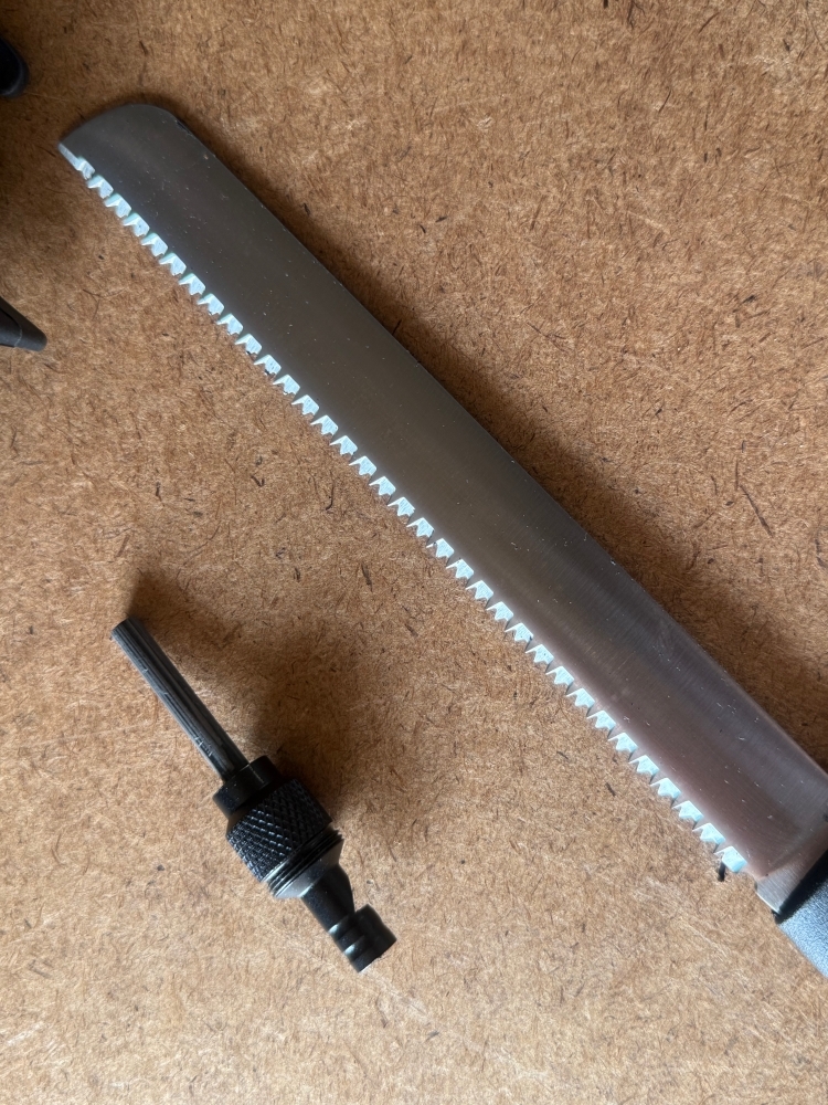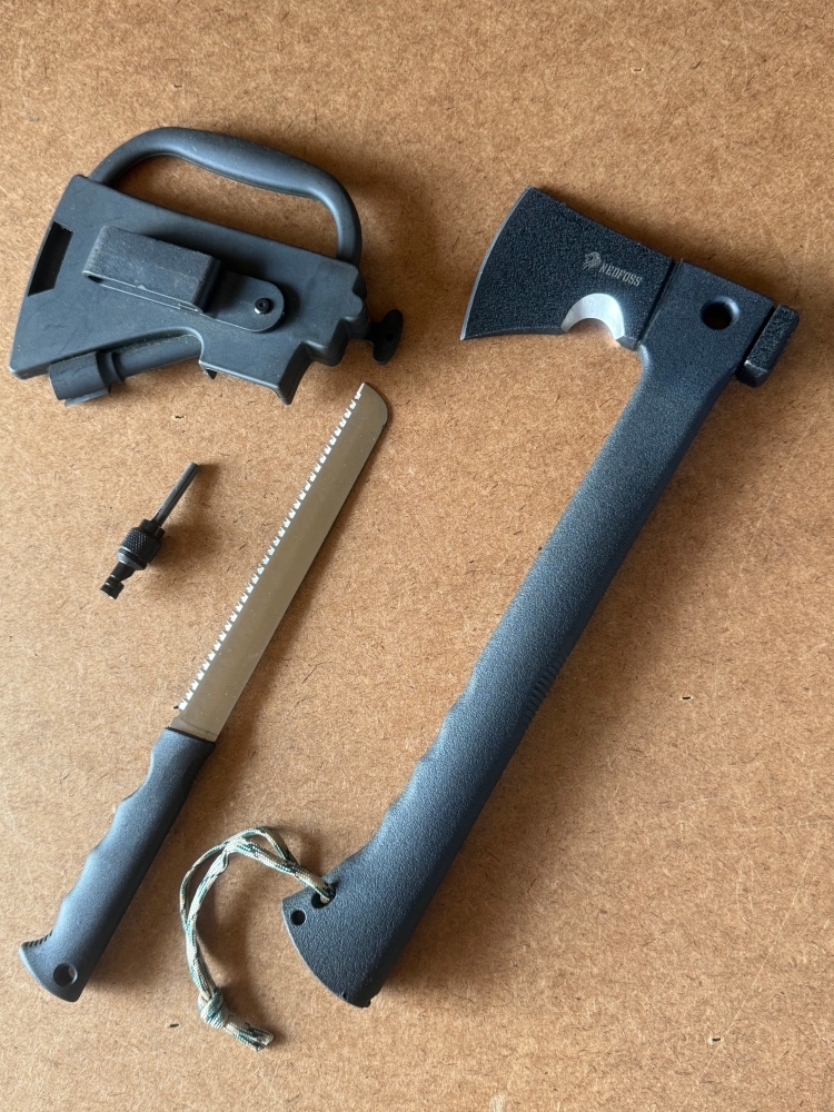 | アックスサイズ | ・アックス 353mm×145mm 刃幅:85mm ・ノコギリ 長さ:300mm 刃:175mm ・笛付火打石:75mm 総重量:719g |
