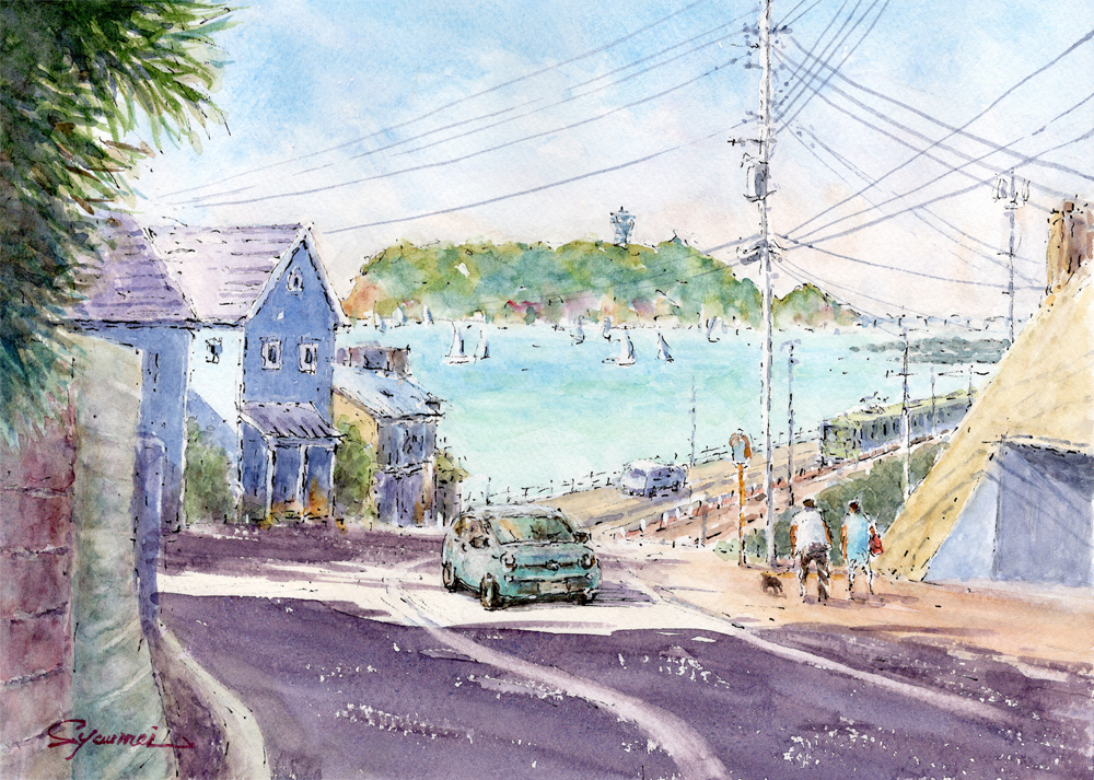 ★水彩画★原画「緑の江の島と七里ガ浜2」#679