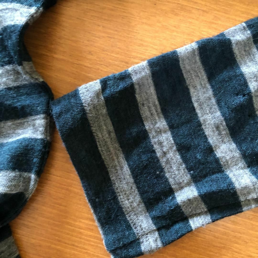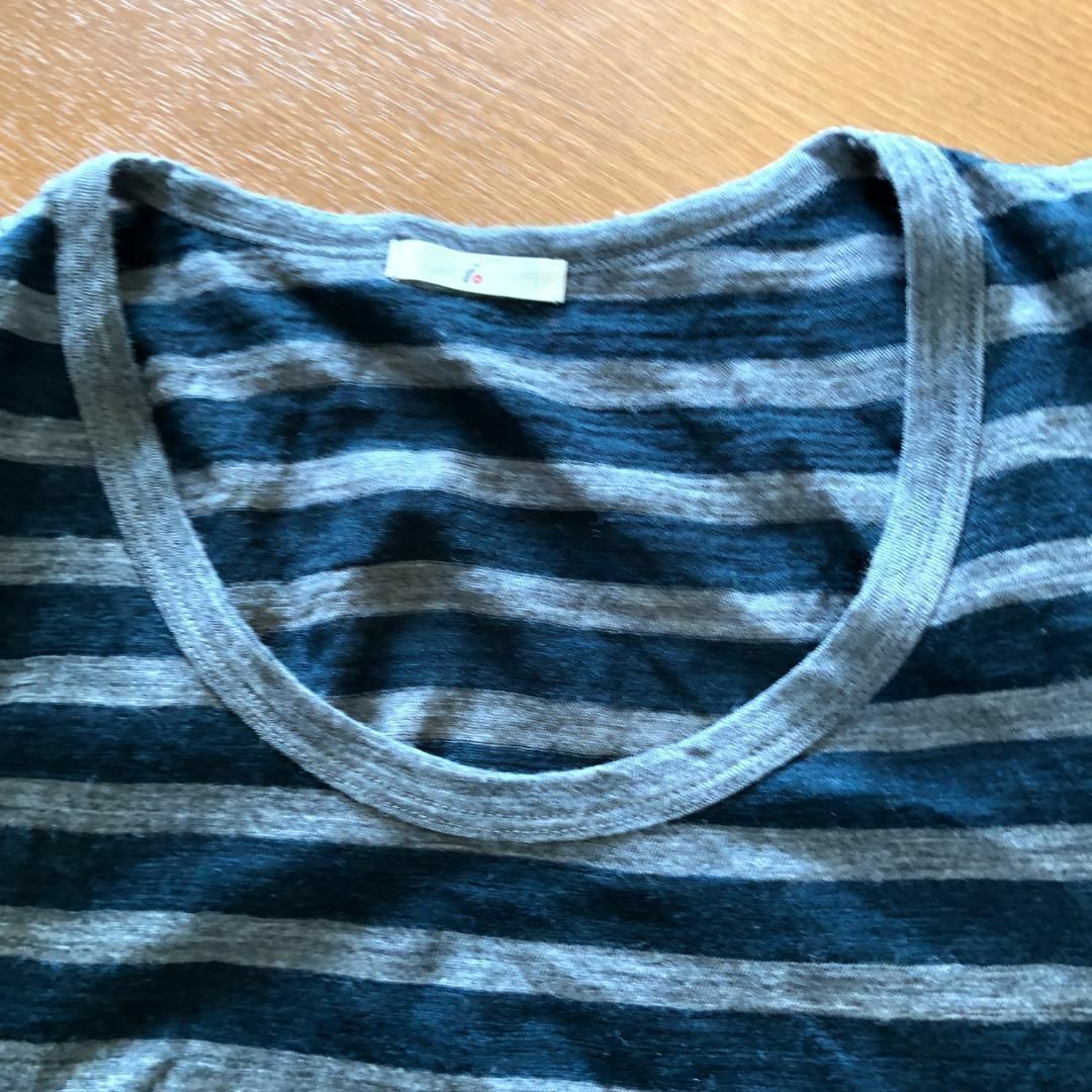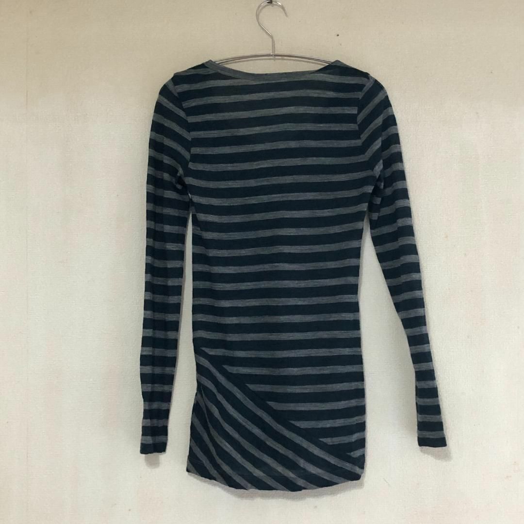 グレーとグリーンのボーダー柄が特徴的な、長袖のカットソーです。