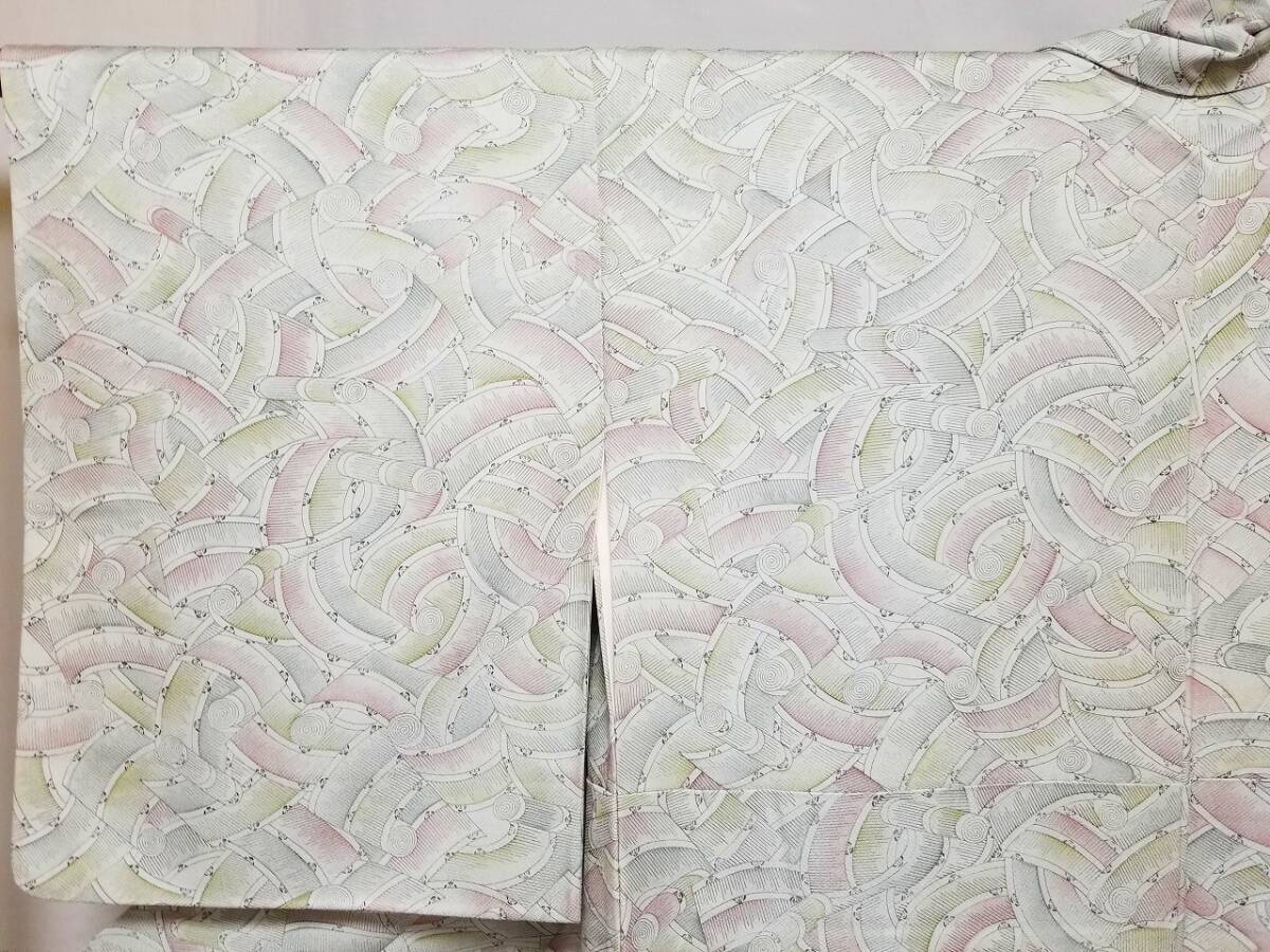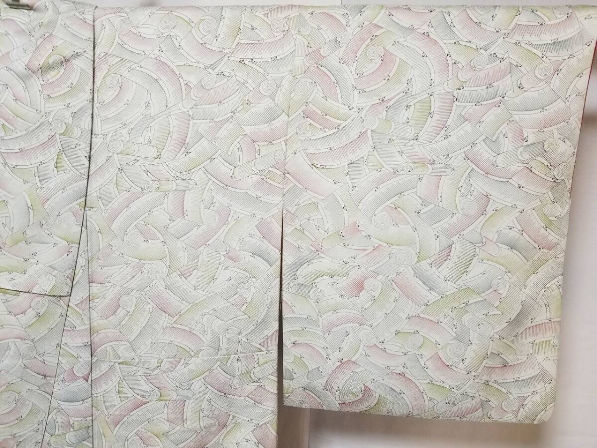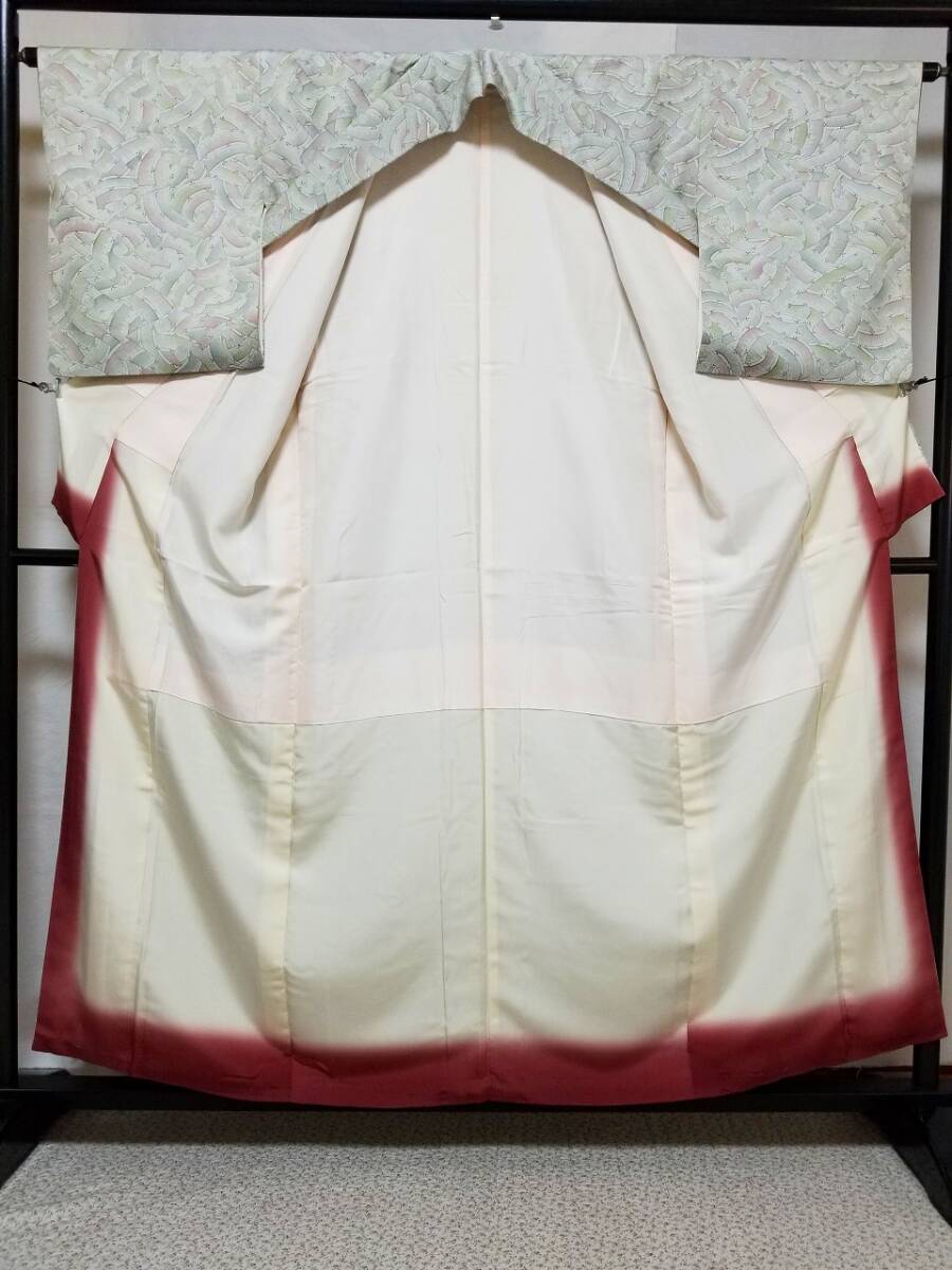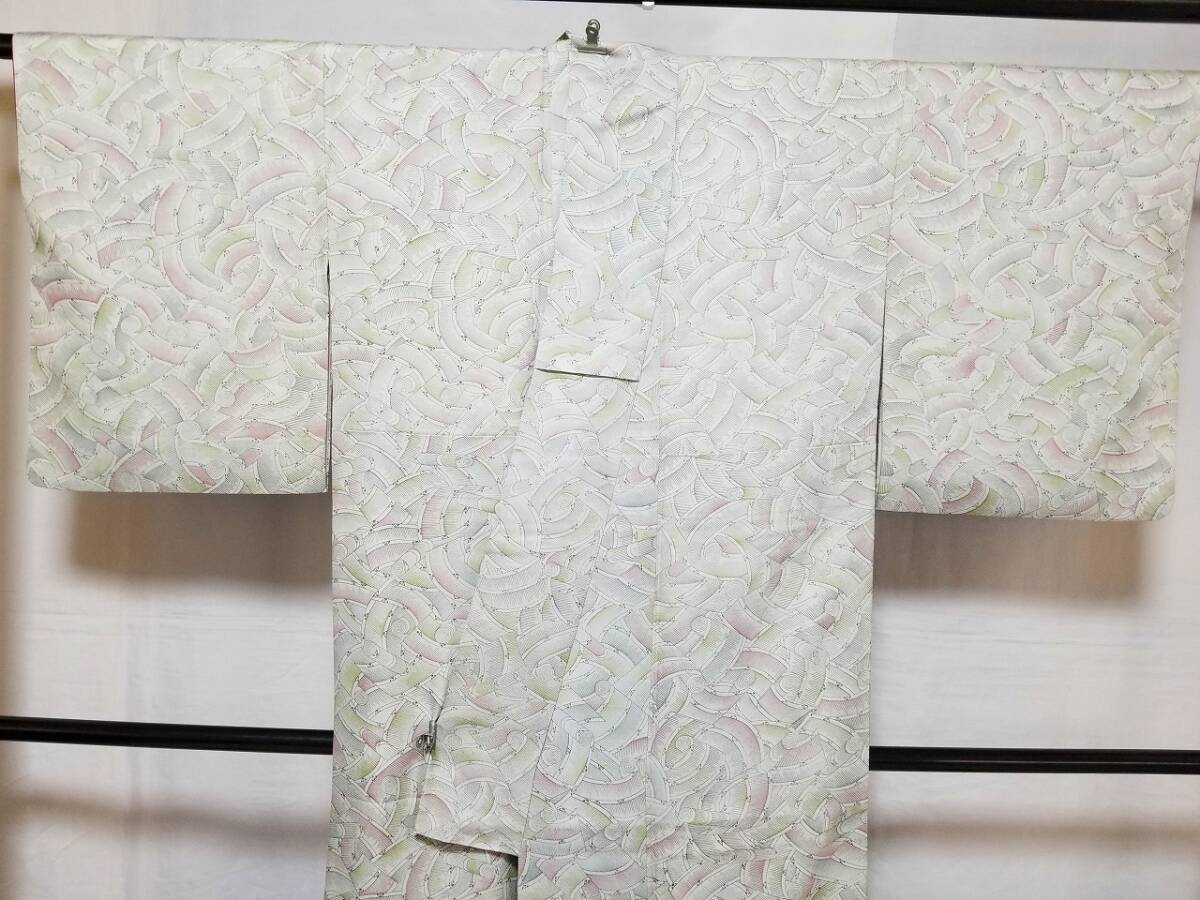 *手縫い仕立て品 *中古品 *未使用品 . *美品 {生地} ☆正絹 丹後 一越縮緬地 {重目地} ☆着物重さ 約 960g {お色と模様} ☆地色は灰白色地 ☆「黄み薄緑色」「灰赤紫色」「銀鼠色」色での手摺り染.暈し染の「巻物文様」 ☆巻物の中には.糸目加工の細線文様 {胴裏地} ☆正絹 羽二重地{薄ピンク色}**美品 {八掛地} ☆正絹 精華 縮緬地{小豆色*暈し染}**美品 ◎消費税は.お預かりしておりません◎ {寸法} 身丈 {肩山から裾まで} 約159cm {内あげ 前身 約13cm 後身 約16cm} 裄丈 約65cm {袖付け縫い代 袖側 約3.5cm 身側 約2cm} 袖丈 約49cm 袖幅 約32cm 前幅 約24.5cm 後幅 約30cm *広衿{スナップ付き} ◎t6227jp 桐輪 「呉服の桐正」でも色々と出品しております** (発送方法) ●大阪から ゆうぱっく発送 80サイズ{補償あり}**おてがる配送 {注意事項} (注意事項 必ずお読みください!) ★基本的に土、日、祝日、ゴールデンウィーク、お盆、年末年始はお休みさせて頂いておりますので、ご連絡が遅れる場合もございますので、ご了承ください。 ★どうぞ自己紹介欄も、是非御覧になって下さいませ。 ★落札後にヤフーから届くメールに、メッセージを記載しておりますので、そちらも必ずご覧下さいませ。 ●当方、ストア出品ではなく、一日中パソコンに向かっておらず、ご連絡は夜になる事が多いです。その点御理解の上、ご入札下さい。 ●お急ぎの場合など、到着希望の日にちが特に近い場合、ご要望にお答えできかねる場合もございます。 もちろん、出来る限り、早急に対応はさせて頂きますが、その点は、何卒ご了承下さいませ。 入札前に、発送が間に合うかご質問頂けるとありがたいです ★★基本的に返品、クレームはお受け致しておりませんが、万が一、商品に不都合(大幅な寸法間違い 記載以外の着用不可能な位の、大きなシミ、傷みなどの見落とし)などがございました場合、まず、取引ナビにてご連絡下さいませ。 迅速に対応させて頂きます。 ただし ●商品がお客様の元に到着後、1週間以上経過したもの。 ●お客様側で加工など、手を加えた物。 ●お色目が、思っていたものと違っていた、または、思っていた感じと違っていた。 (画像はできるだけ実物に近い色で写るように努力していますが、素人の撮影ですので、どうしてもPCによって多少違ってくる事があります。 出来るだけ、分かりやすいように説明は入れさせて頂きます。分かりにくい場合、ご質問下さい。) 以上につきましては、対応出来ませんので、ご理解下さい。 ★複数商品の落札予定のある場合、ご連絡頂きましたら、1週間程でしたら、お取り置させて頂きます。 お気軽に、お申し出下さいませ。 ★送料は、1個で発送が無理な場合は、こちらよりご連絡させて頂きます。 | |||