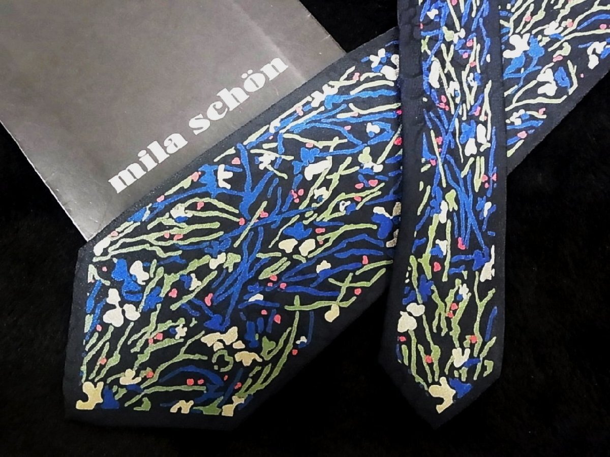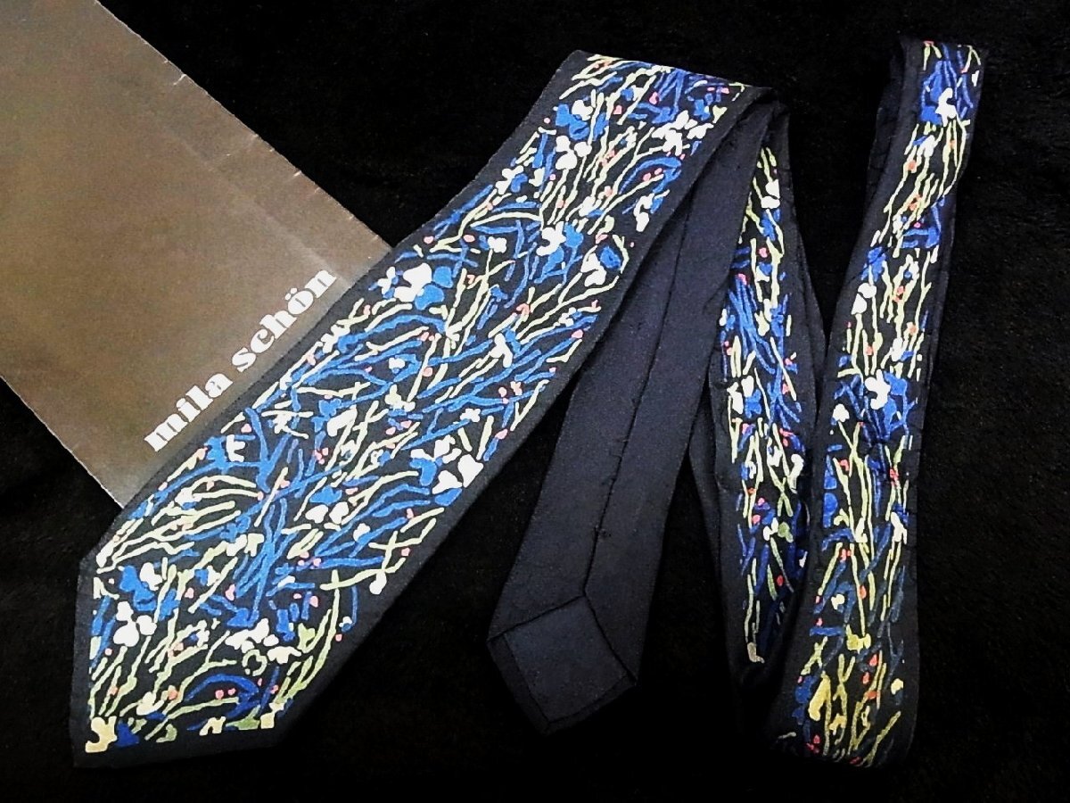 ♪今週の特売980円~♪2771♪状態並品【mila schon】ミラショーン【花 植物 mロゴ 柄】ネクタイ♪