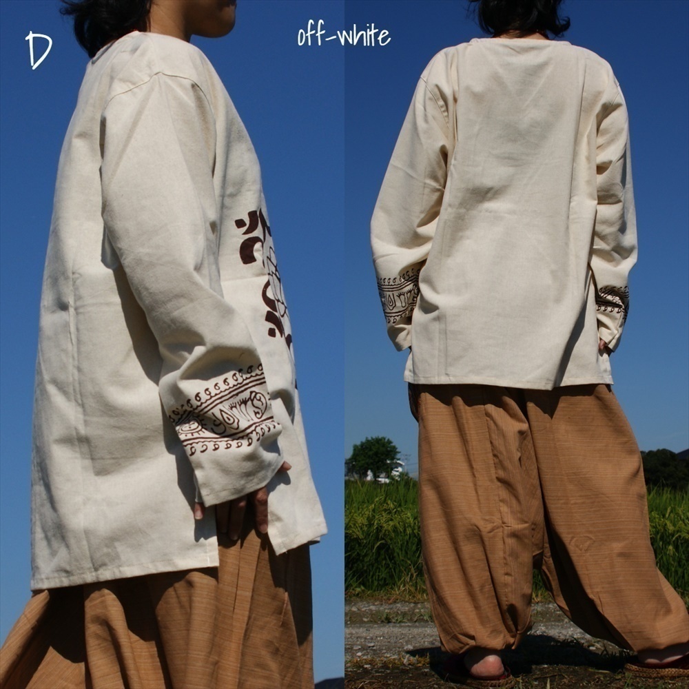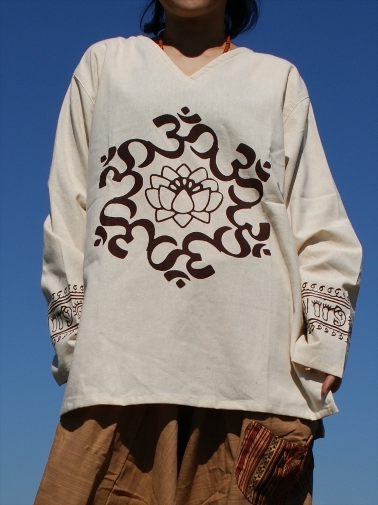 ★エスニック プルオーバー 長袖 オフホワイトロータス 厚手コットン送料込★新品未使用★アジアン クルタ 透け感無し ユニセックス