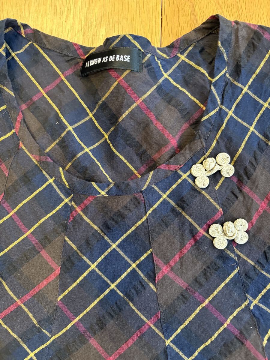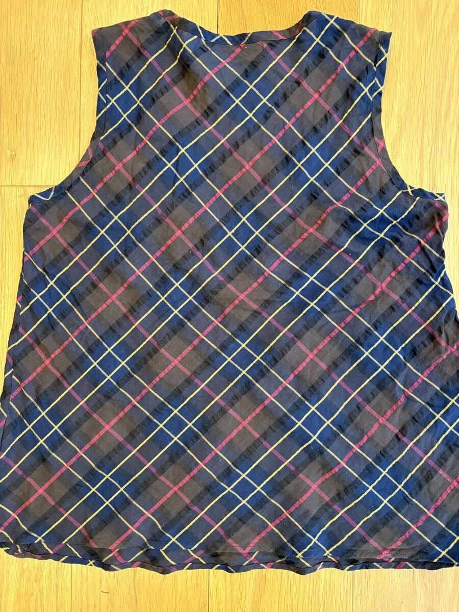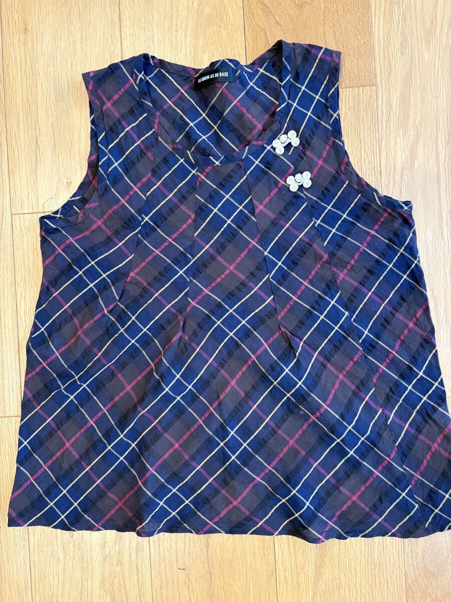 濃紺のチェック柄、ノースリーブブラウス 装飾付きでカジュアルに最適。