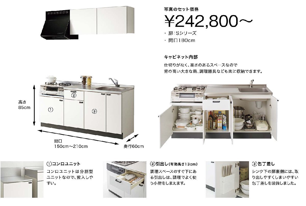 | ◎クリナップ・コンパクトキッチン『新コルティ』テーブルコンロタイプ 間口1800mm・即決価格は、写真セット定価242.800円のなんと 55%OFFで120.186円【消費税込】 ◆うれしい機能がギュッとつまったコンパクトキッチンです。 ◆コンロユニット分割型で搬入しやすい、テーブルコンロタイプ。 ◆コンロの取り換えがしやすい、テーブルコンロタイプ。(ガスコンロは価格に含まれていません) ◆吊戸棚の高さは500㎜。 ◆扉の色は、Sシリーズ8色から選択できます。 ◆写真の扉の色は、スエードホワイト。明るくシンプルな色です。 ◆ワークトップは、ステンレスです。 ◆シロッコファンが付いています。 ◆W530のシンク。 ◆シンクの位置は、右側・左側から選択してください。 ◆CAボードは価格に含まれていません。 | |