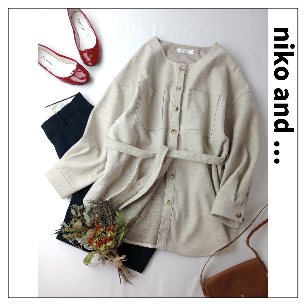 niko and ... ニコアンド「やわらか雰囲気を演出。」ニットソー シャツ ジャケット ノーカラー ウエストリボン 4 L ベージュ(30M+7816)