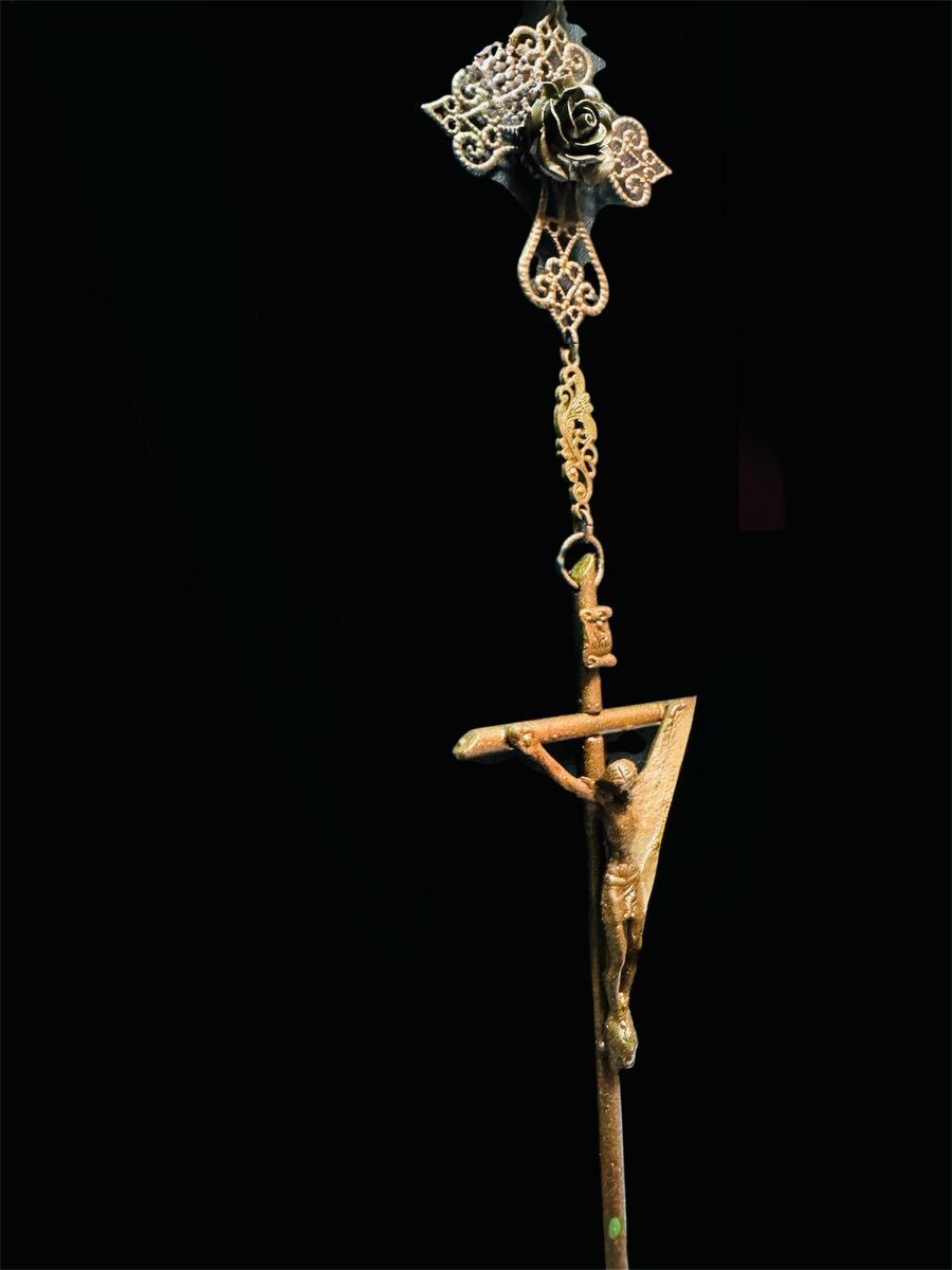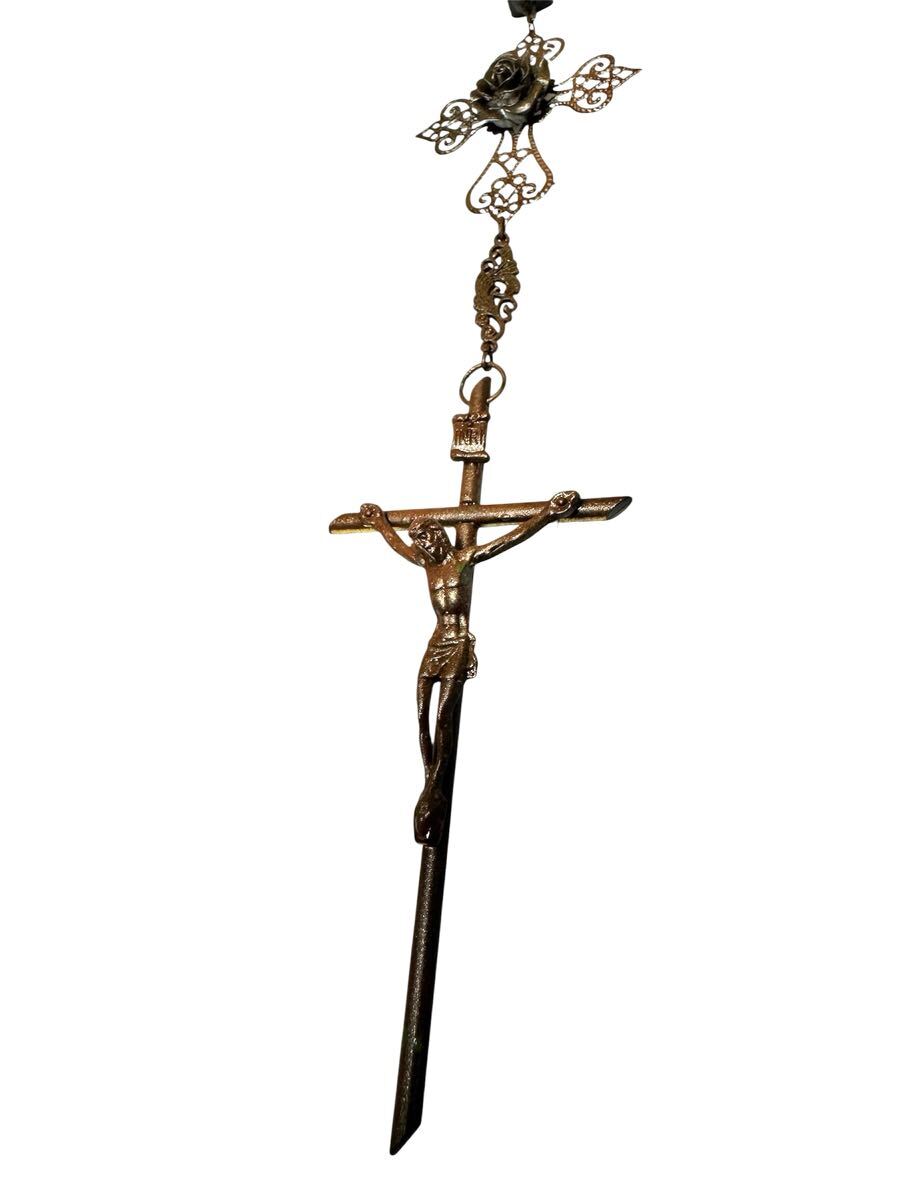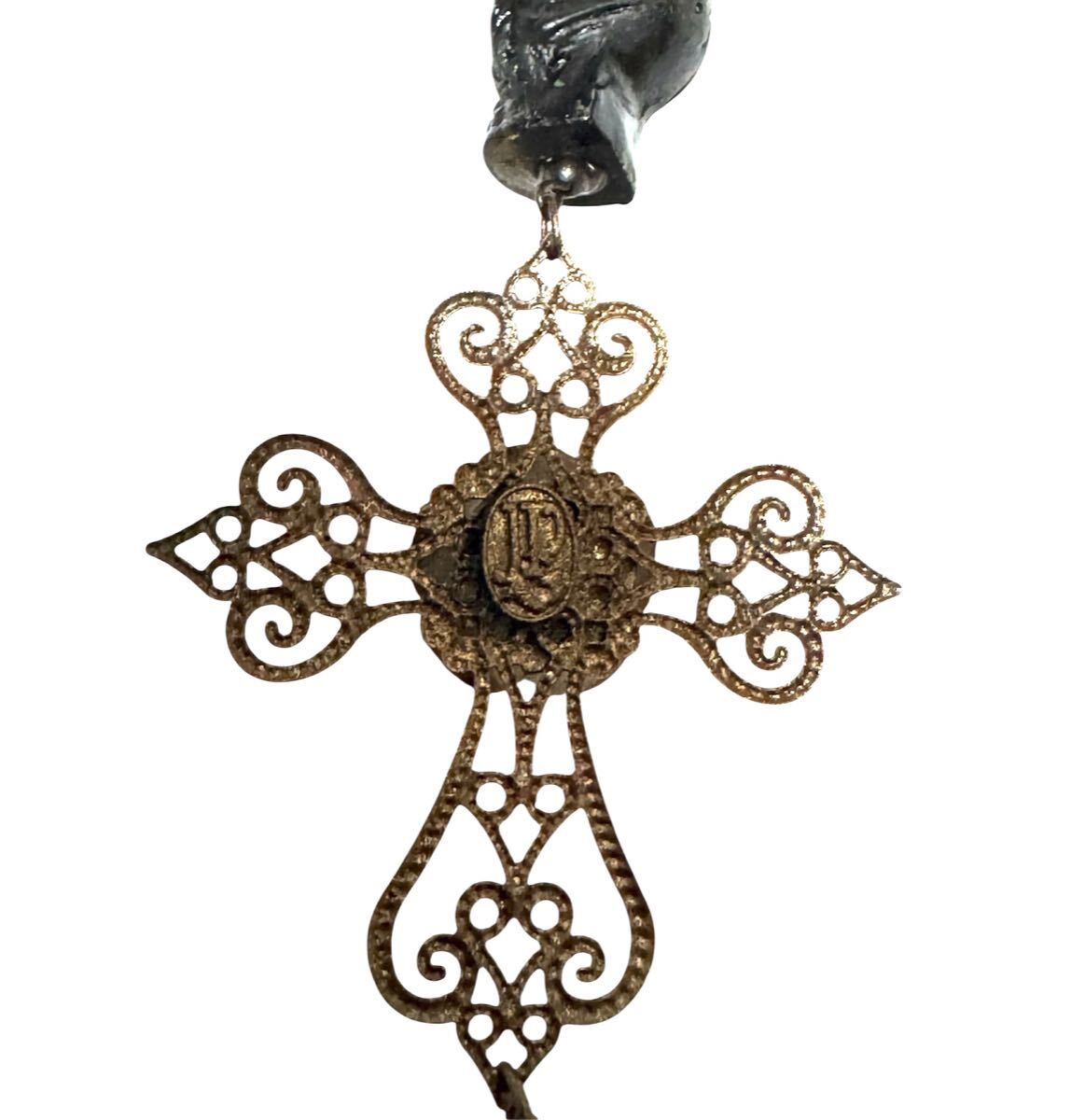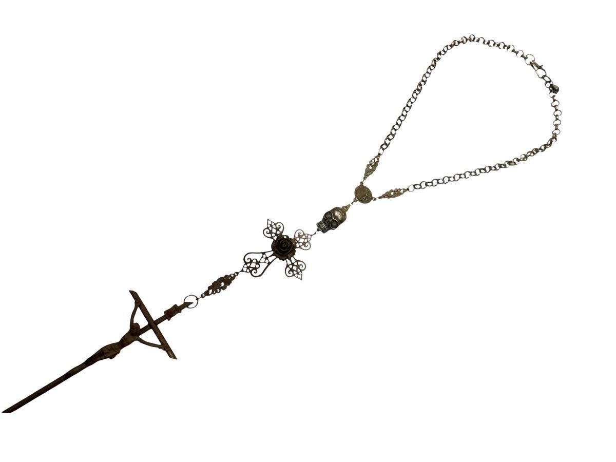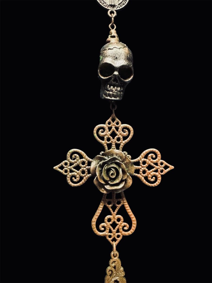 アンティークカラーに十字架に薔薇メダイのロザリオネックレスです。スカルがワンポイントにデザインされています。