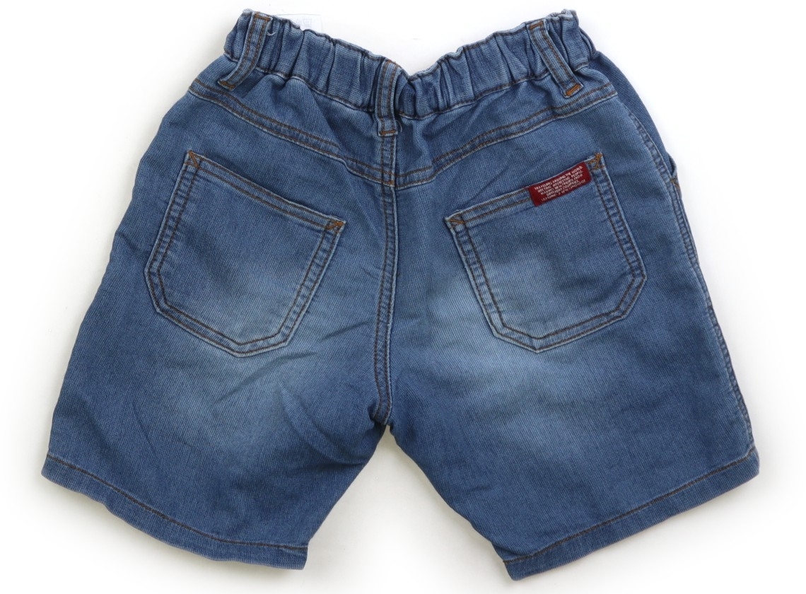 綿・ポリエステルのデニム風。ウエストは総ゴムですがねじれています。左裾に糸の飛び出しがあります。全体的に毛羽立ちと色褪せがありますが、まだお使いいただけそうです。