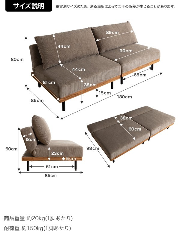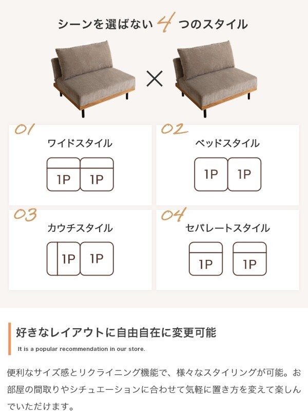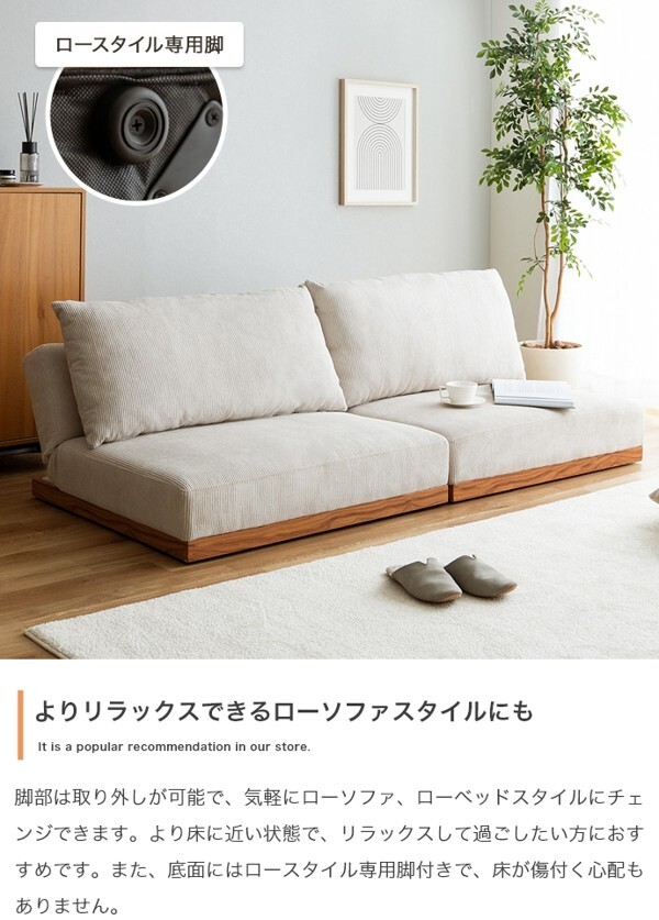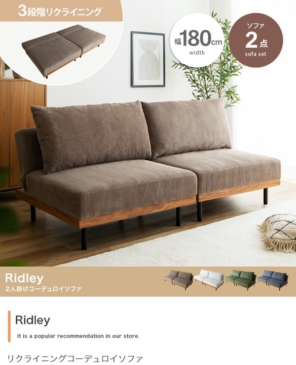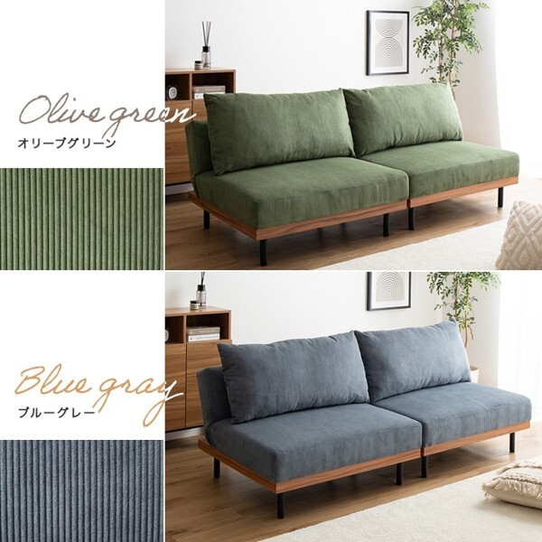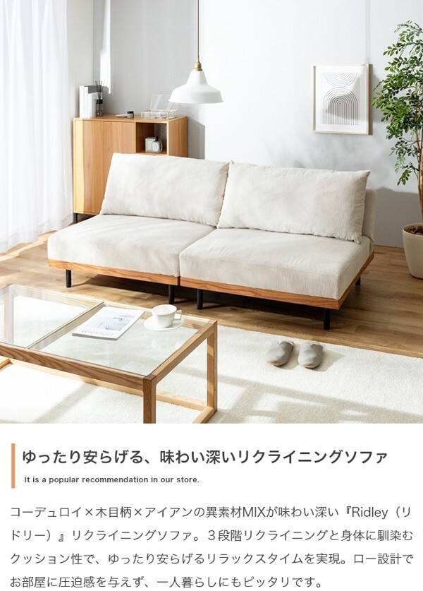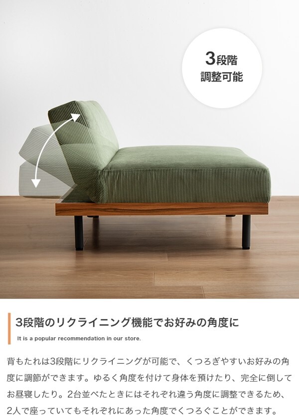 ※現在ご覧の商品ページはオリーブグリーンのご購入ページとなります。 ヤフオクの仕様上単一ページに複数バリエーションを掲載することができませんので、他バリエーションが希望の場合は別ページでご購入お願い致します。 コーデュロイ×木目柄×アイアンの異素材MIXが味わい深い『Ridley(リドリー)』リクライニングソファ。 コーデュロイの優しい肌触りと心地よい弾力のクッション、3段階リクライニングで快適なくつろぎタイムを叶えます。 背もたれを完全に倒しきるとソファベッドになり、友人や家族が泊まりに来た際の簡易ベッドとしても活躍。 分割構造のため、テーブルを挟んだりカウチソファに変更したり、自由自在にスタイリング可能です。 脚も取り外せるロー設計のため圧迫感が少なく、ワンルームなどのスペースに余裕のないお部屋にもピッタリです。 配達業者を指定いただくことはできません。 沖縄・離島に関しましては、別途配送料が必要となります。 北海道への配送も別途配送料が必要になる場合がございます。 ※別途送料が発生する場合は後ほどご連絡させていただきます。 タイミングによっては在庫切れの場合があります。