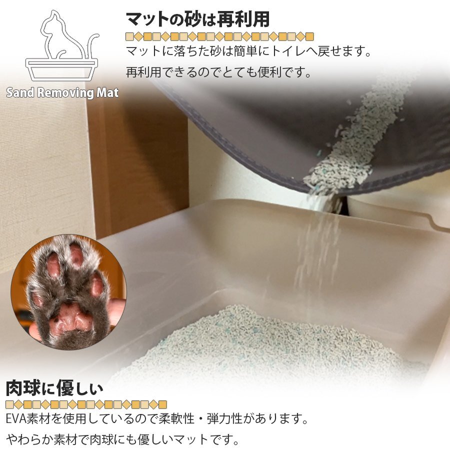 | ・猫のトイレの砂の飛び散りを防止!トイレから出る際の肉球に挟まった砂もキャッチ! ・飛び散った砂は再利用できます。 ・汚れたら水洗いが可能!いつでも清潔に使用る! ・軽くて扱いやすい!トイレへ砂を戻すのも楽ちん! ・EVA素材を使用しているので耐久性抜群です。 ・ネコちゃんの爪にも強い!耐衝撃性! ・弾力性がありネコちゃんの肉球にも優しい。 ・3サイズ展開で、子猫から多頭飼いの方まで幅広くご使用いただけます。 |