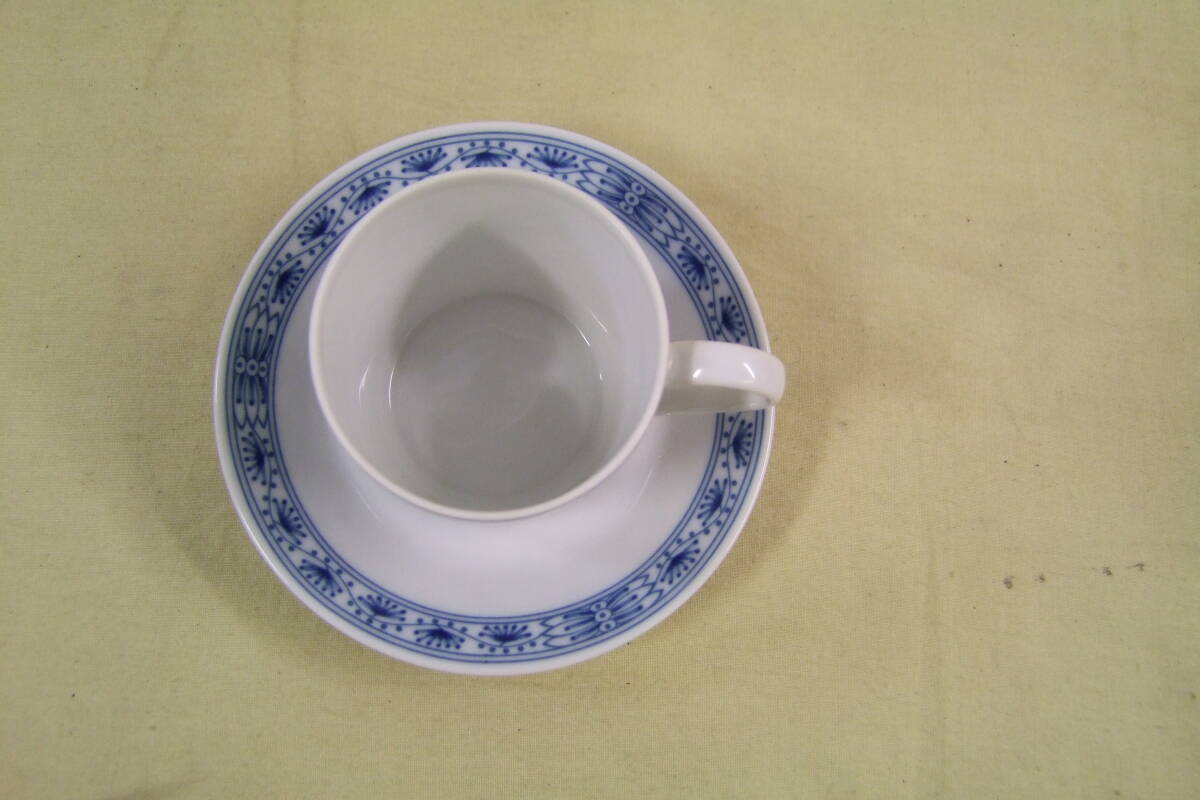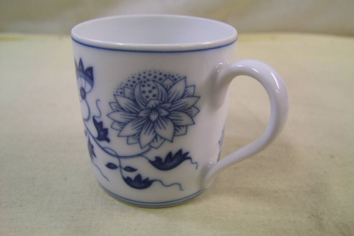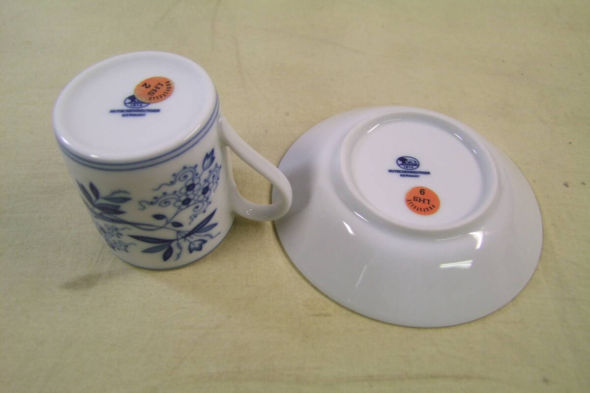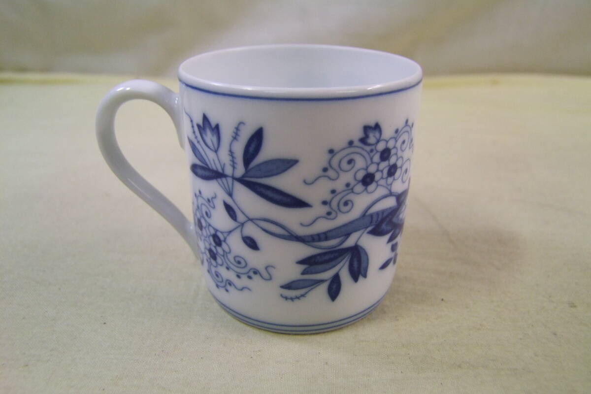 御覧の様なフッチェンロイター ブルーオニオン デミタスカップ&ソーサー 1客です。カップの口径5.1cm、高さ6cm、ソーサー径11.2cm程の品です。元の箱はありません。当方の品は一度人の手に渡った物ですので、完品をお求めの方は入札をご遠慮ください。ゆうパック元払で発送いたします。