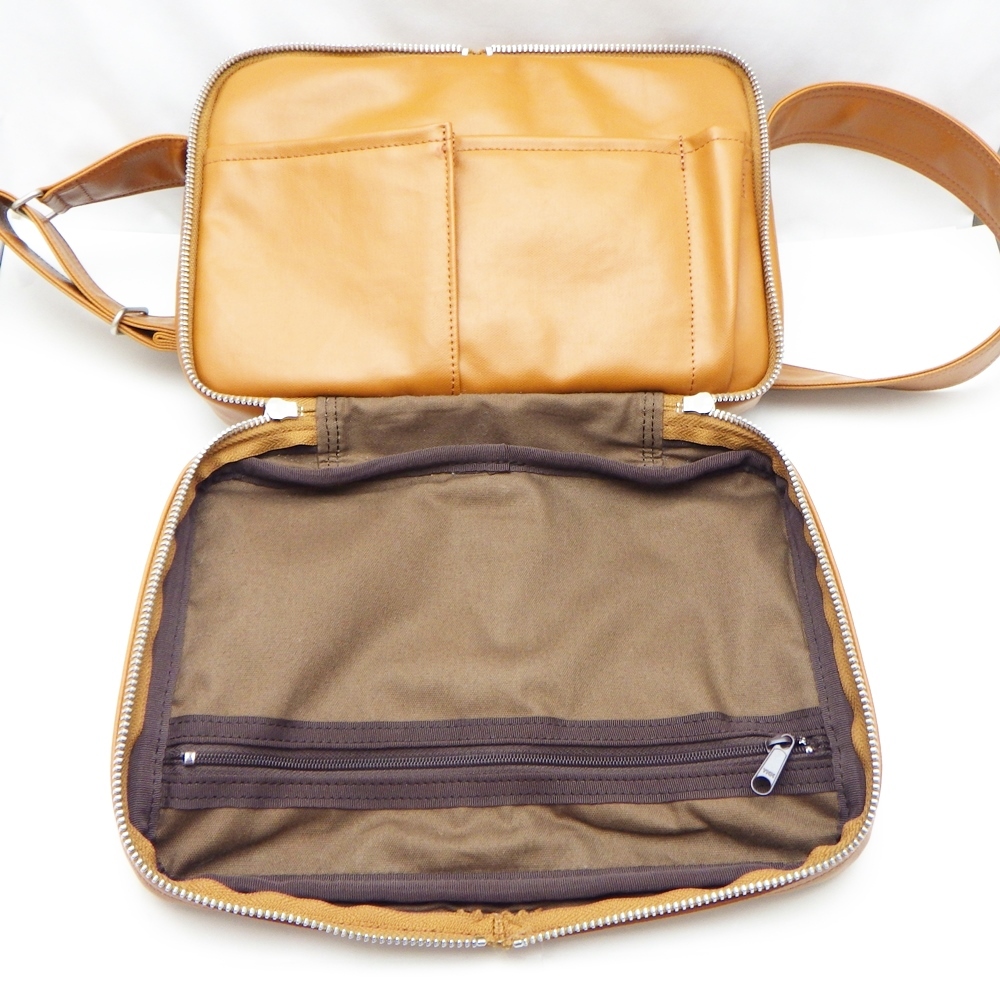 仕様: 外側ファスナーポケット、Wファスナー開閉メイン1(中にファスナーポケット、オープンポケット×2、ペンホルダー)、ファスナー開閉メイン2(中にマジックテープ式ポケット)