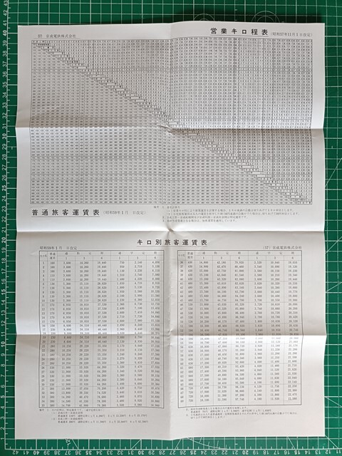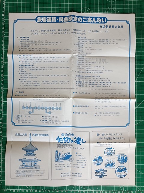 八つ折り。営業キロ程表(昭和57.11.1改定)、普通旅客運賃表(昭和59.1改定)。広告欄に観光スタンプ案内(掲載は6種)あり。