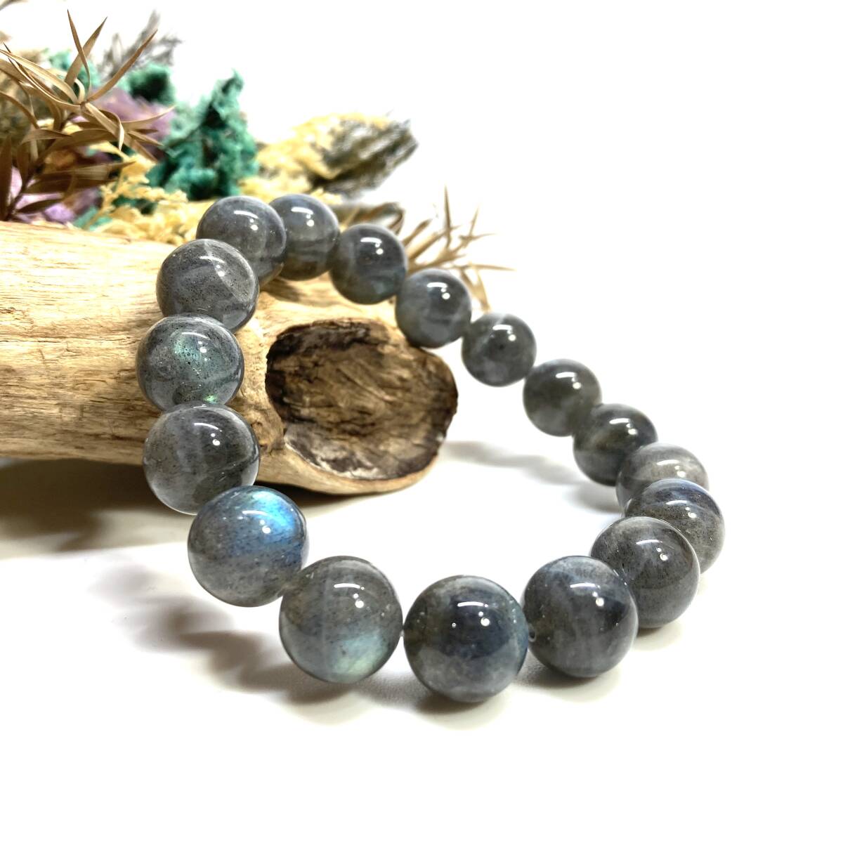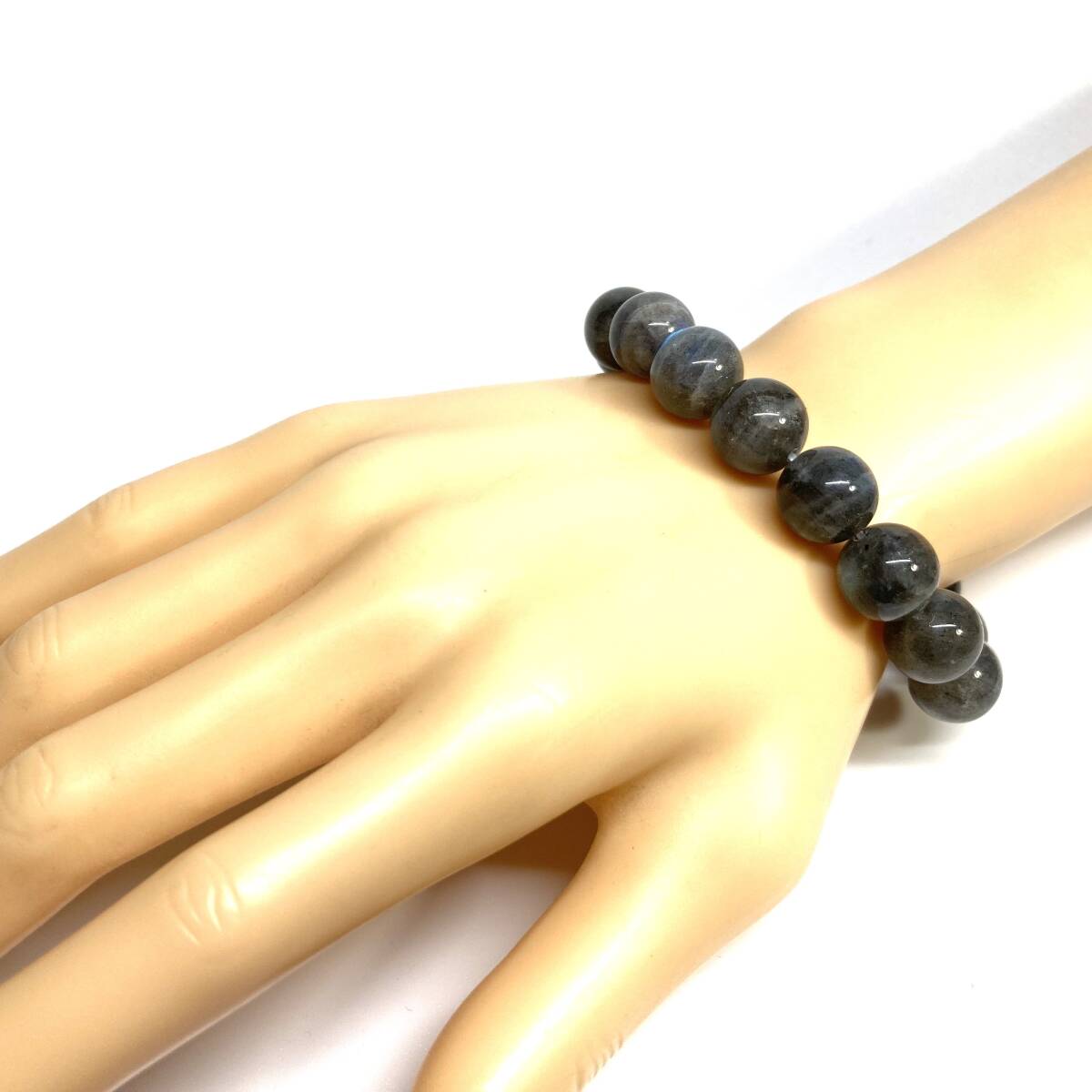 こちらは、12mm玉のラブラドライトを使用したパワーストーンブレスレットです。シンプルなデザインは、男女問わずどんなコーディネートとも合わせ易いブレスレットです。サイズは内周約17cmです。数に限りがございますので気になる方はお早めにどうぞ。