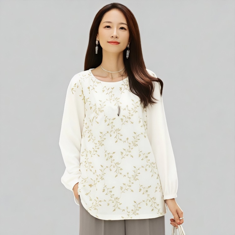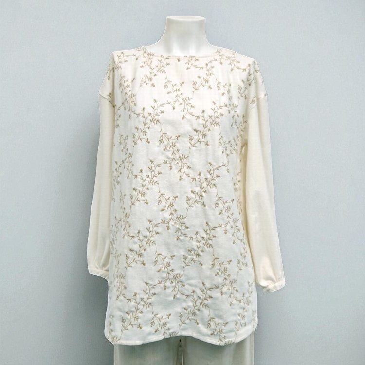 前身花柄刺繍 ギャザーブラウス 微起毛コットン100% M~L・オフホワイト23078012