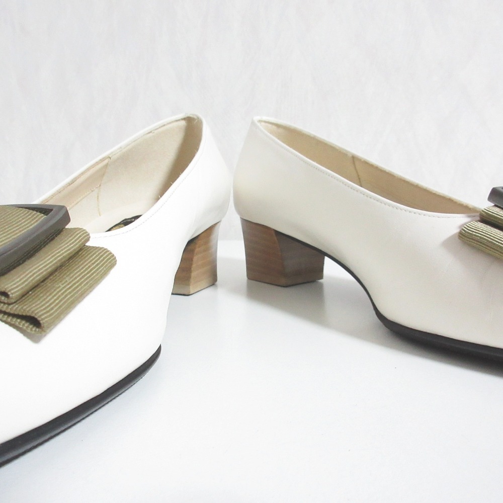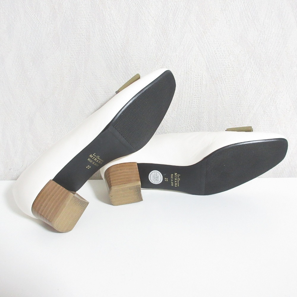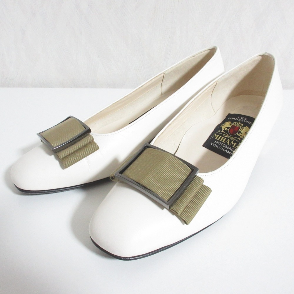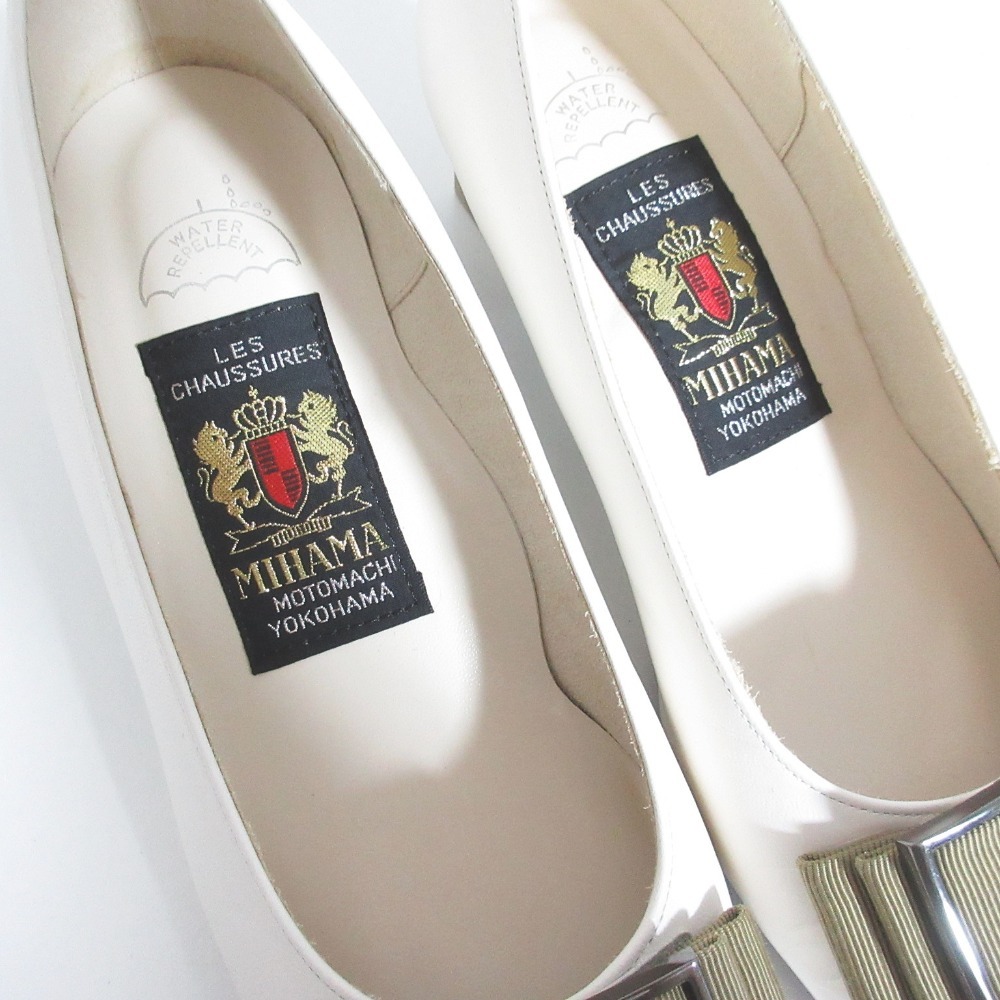 美品 MIHAMA ミハマ レザー グログランリボン 撥水 スクエアトゥ チャンキーヒール パンプス 22cm アイボリー