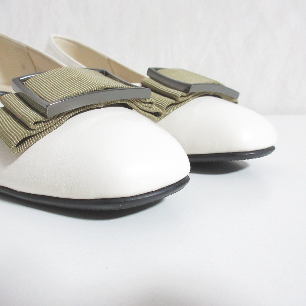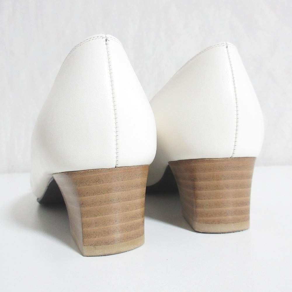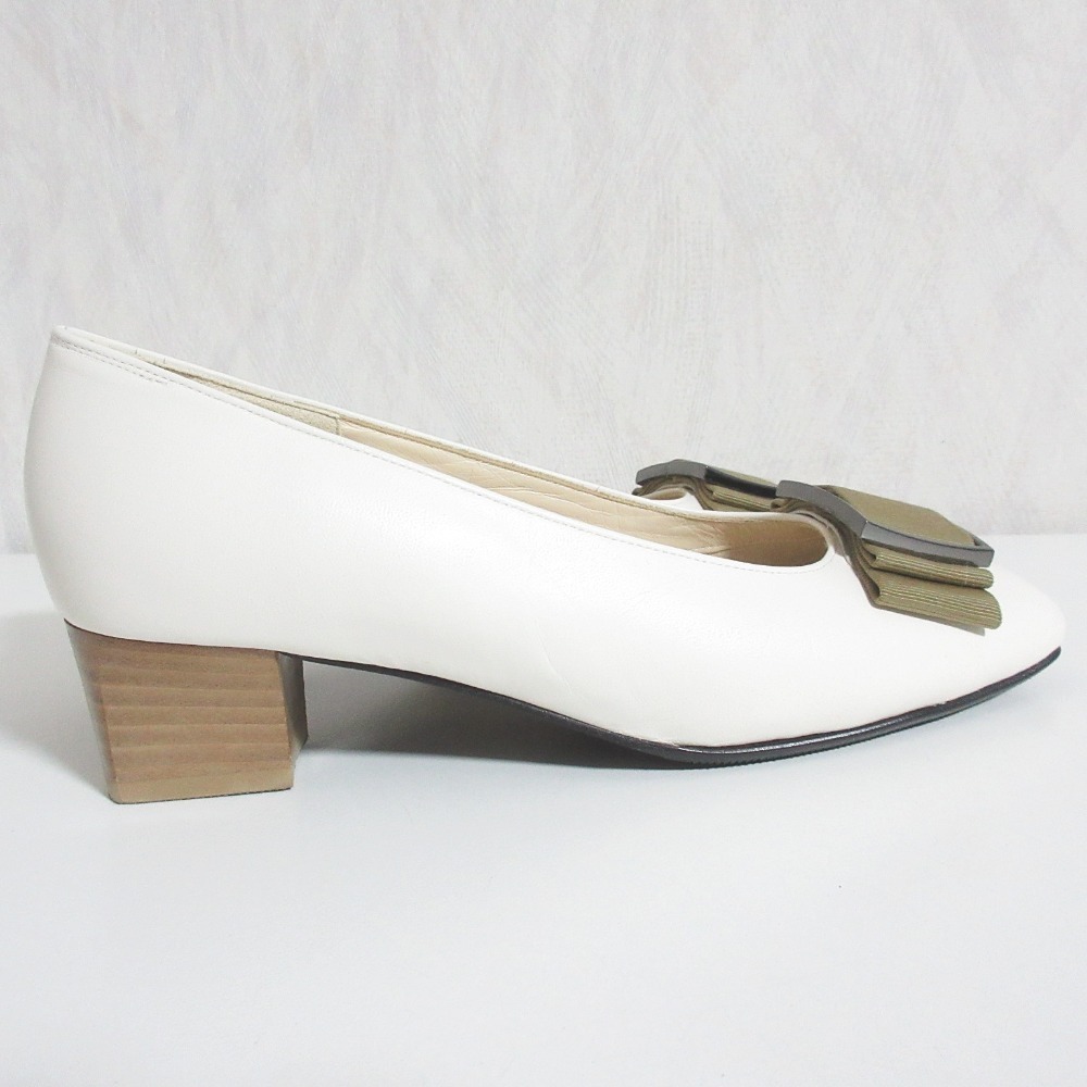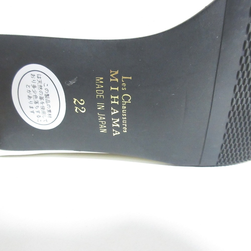美品 MIHAMA ミハマ レザー グログランリボン 撥水 スクエアトゥ チャンキーヒール パンプス 22cm アイボリー