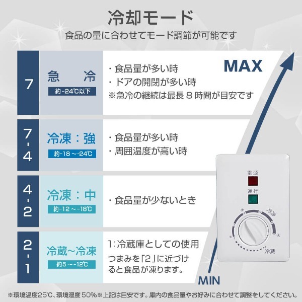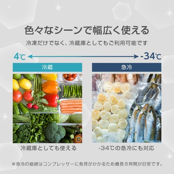 【7段階温度調節機能】1時間で極寒世界を作る.段階温度調節機能で、食材の特性にピッタリ合わせた保存が可能。
