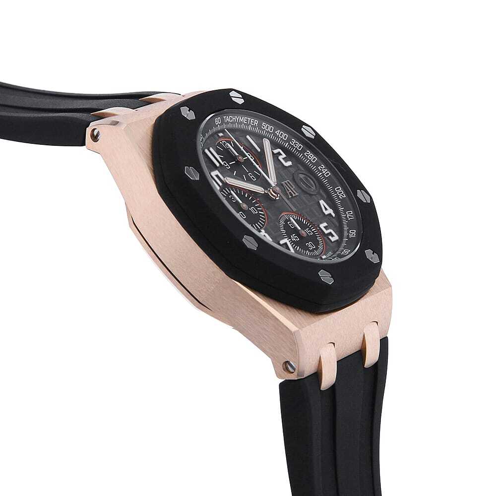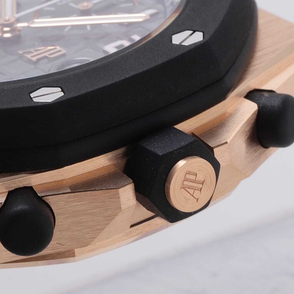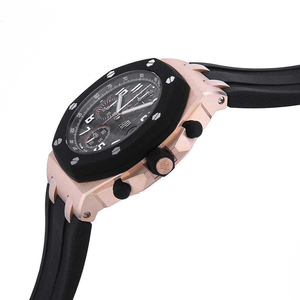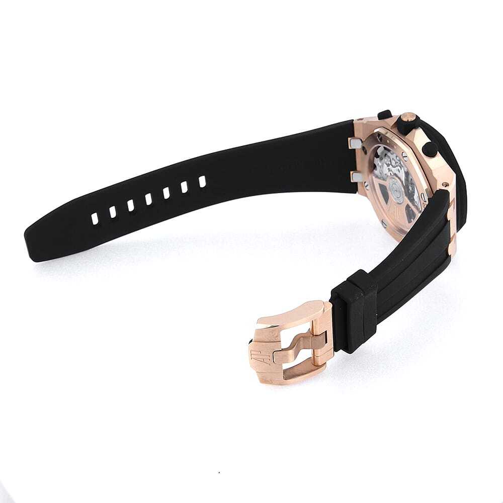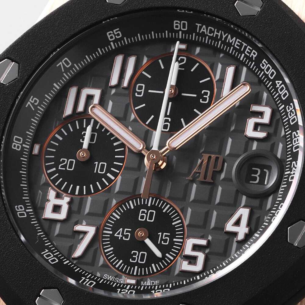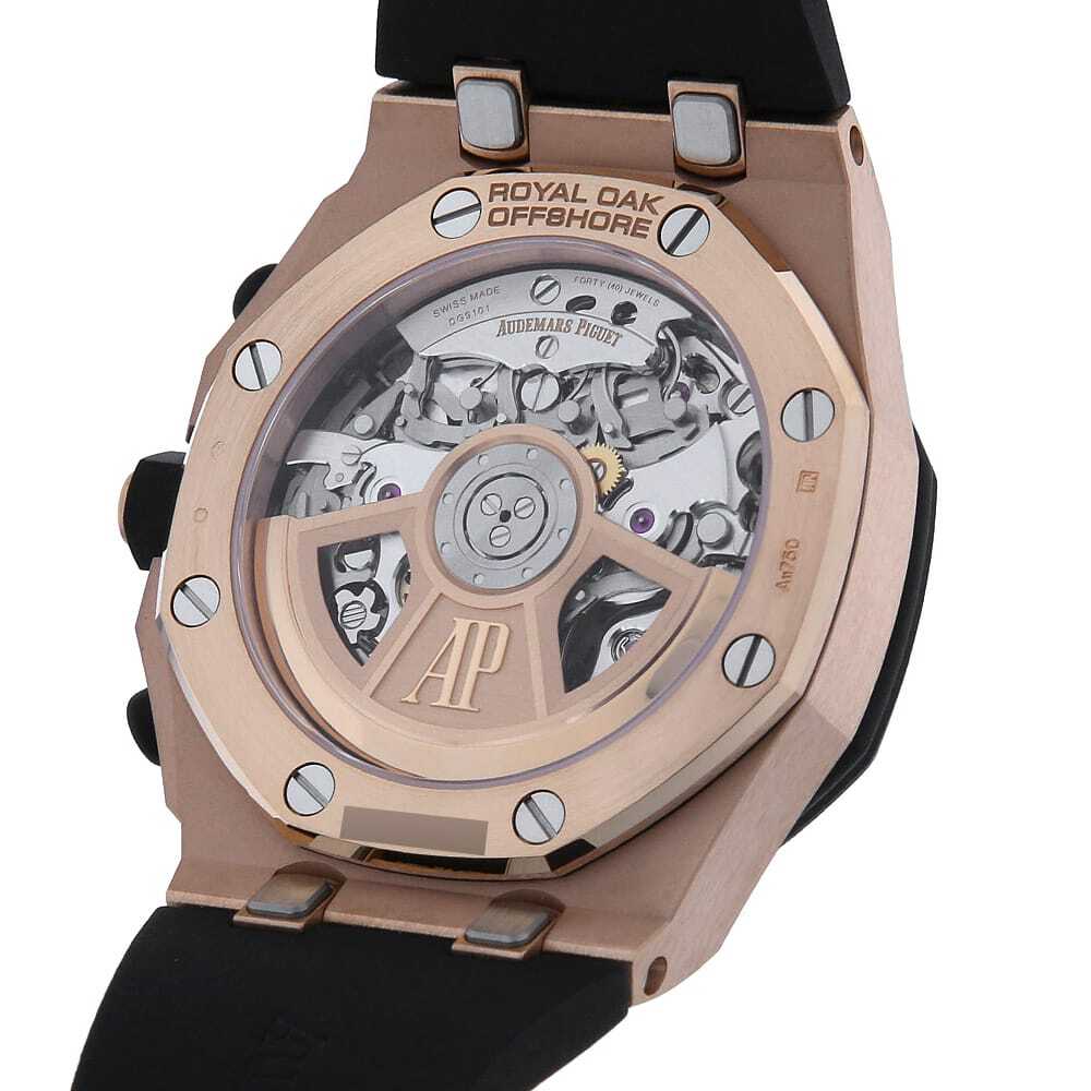 | モデル情報 | ロイヤルオークの象徴的なパターンを拡大した力強いデザインでピンクゴールド×ブラックのコントラストを用いてスポーティーさと高級感を両立しています。オーデマ・ピゲの技術力とデザイン哲学を体現した1本です。 |