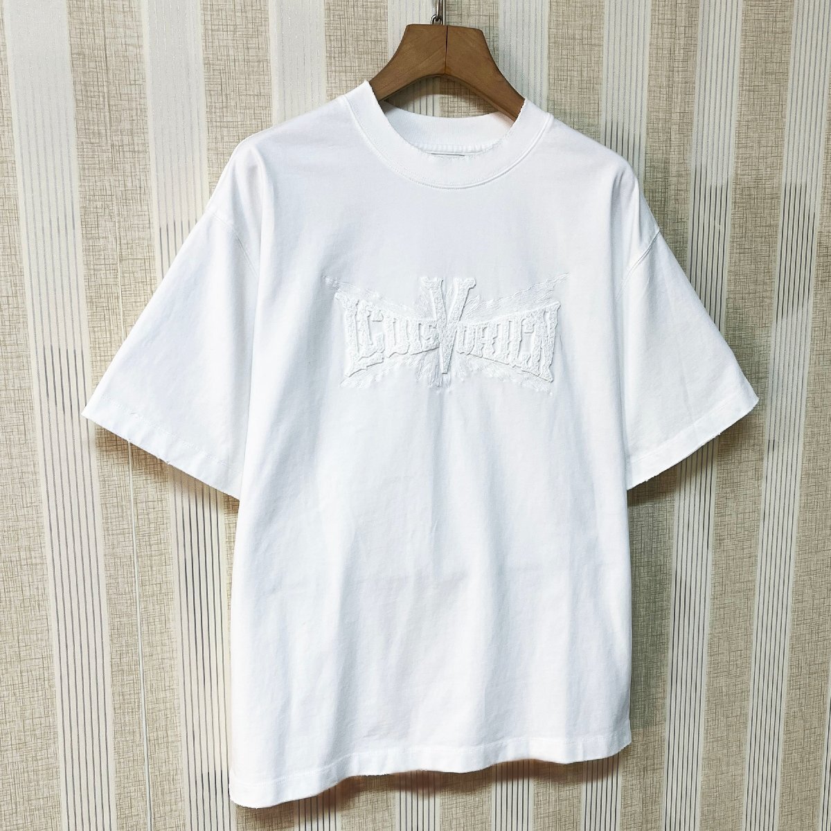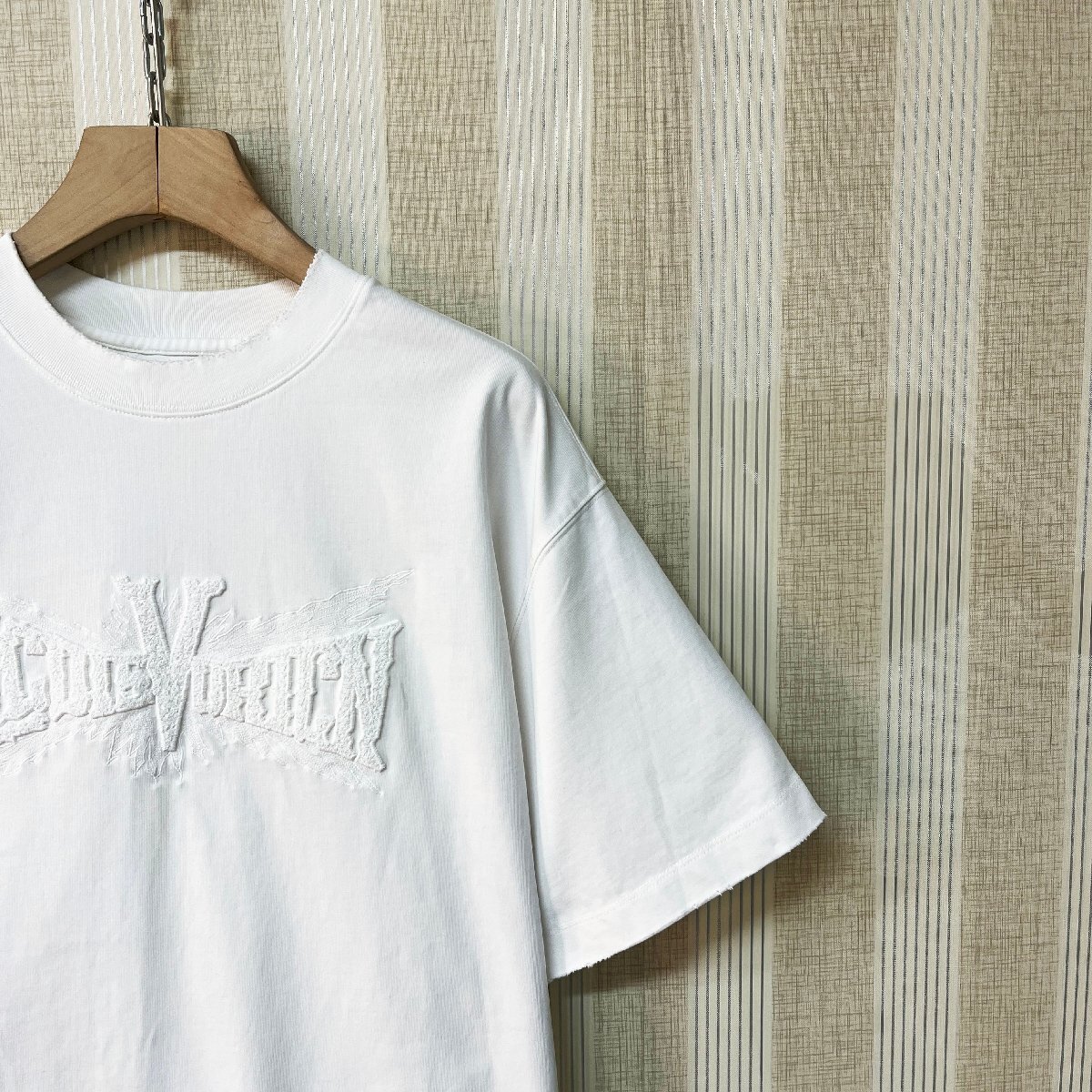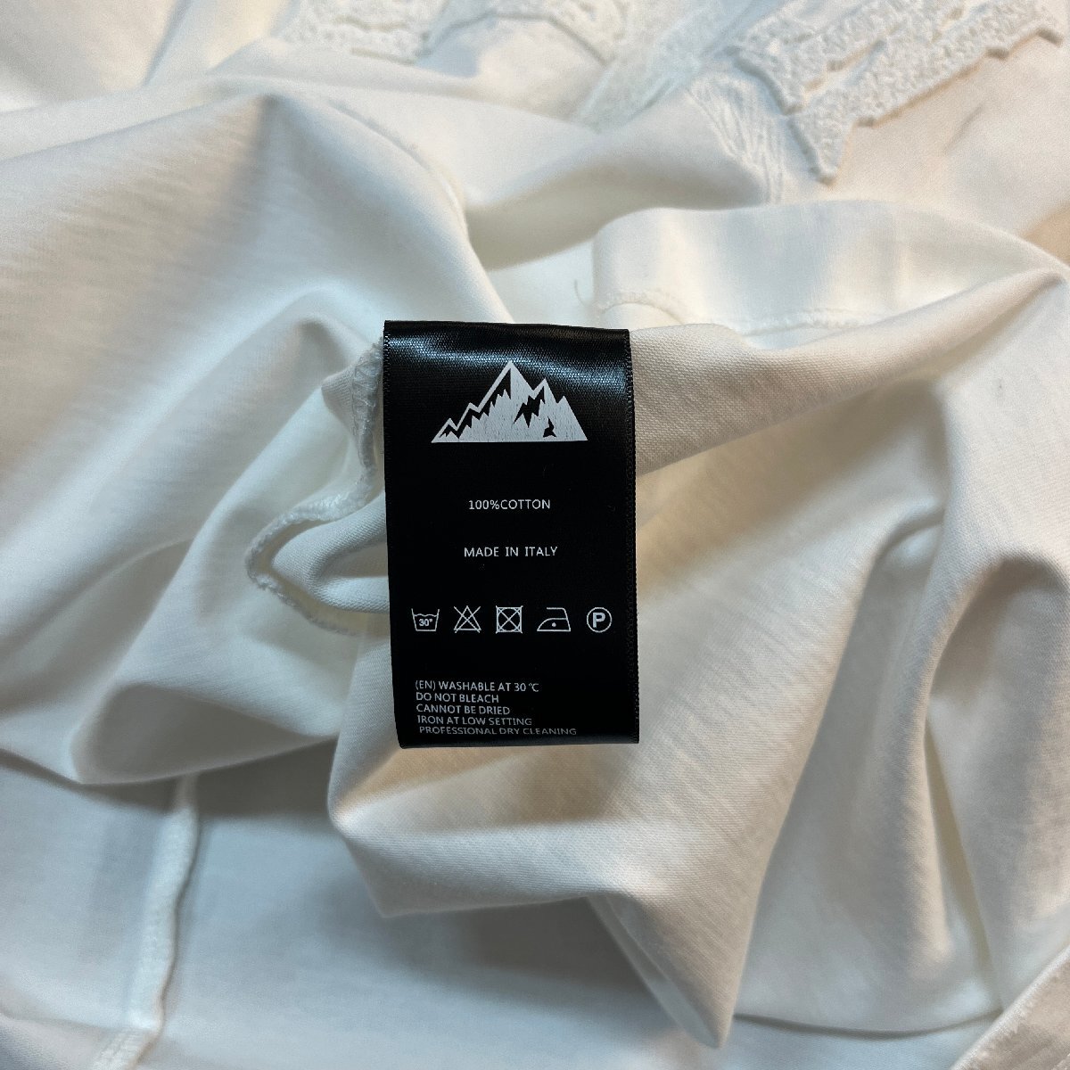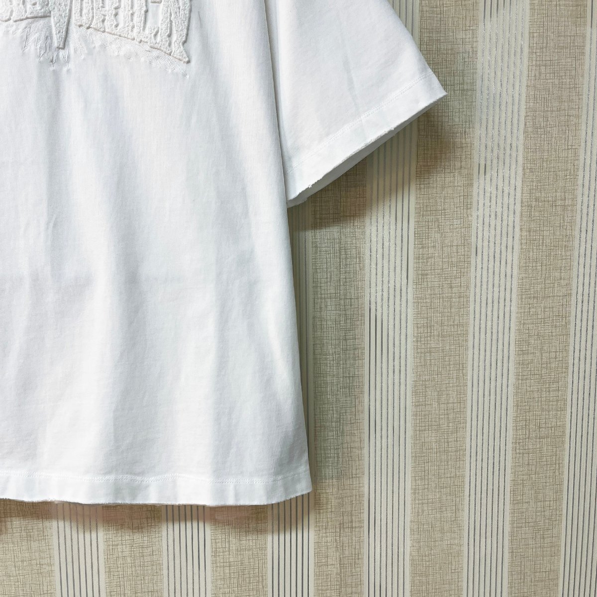 フロントの英字刺繍は同色糸を使用し、さり気ないキラキラ感と凹凸感のが魅力。控えめながらも上品なアクセントを添えてくれます。襟ぐり狭めのラウンドネックとしっかりとした生地感で、清潔感ある大人カジュアルスタイルを構築します。
