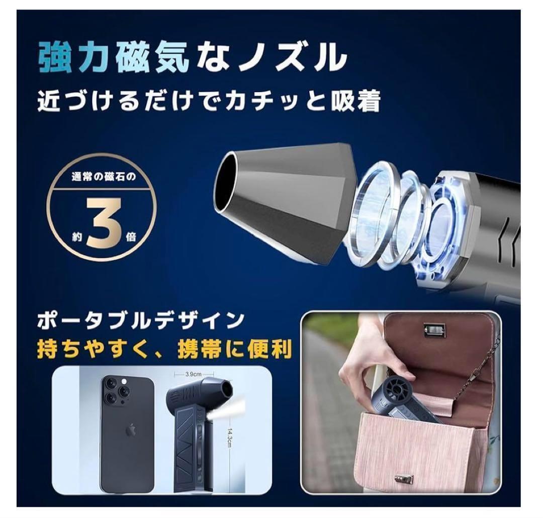 【携帯設計、マグネットで近づけるだけで簡単吸着】通常の磁石の3倍のマグネット内蔵し、強力磁気なノズルは近づけるだけでカチッと簡単吸着!位置合わせや回転などの面倒な作業が不要です。取り付け時や取り外し時に、鳥肌が立つような耳障りな音はもうありません。コンパクトで軽量な構造、重量500 g未満の小型 エアダスター、ポケットに簡単に入れられ、片手で操作でき、家庭での使用にもプロのシーンでも、持ち運びや操作が簡単で、どこにでもいる清潔なヘルパーがいます。