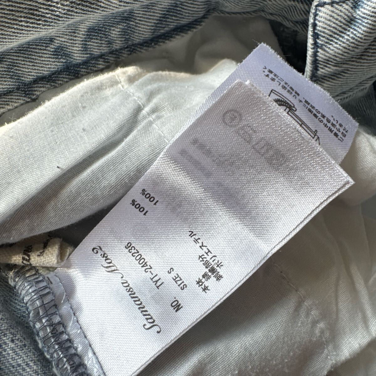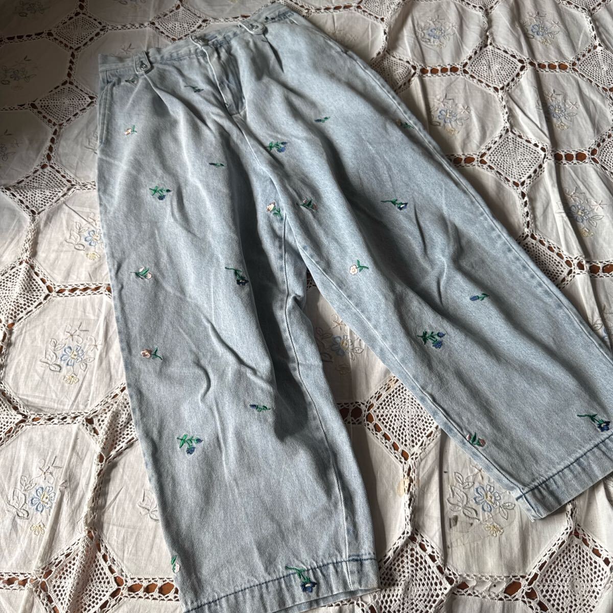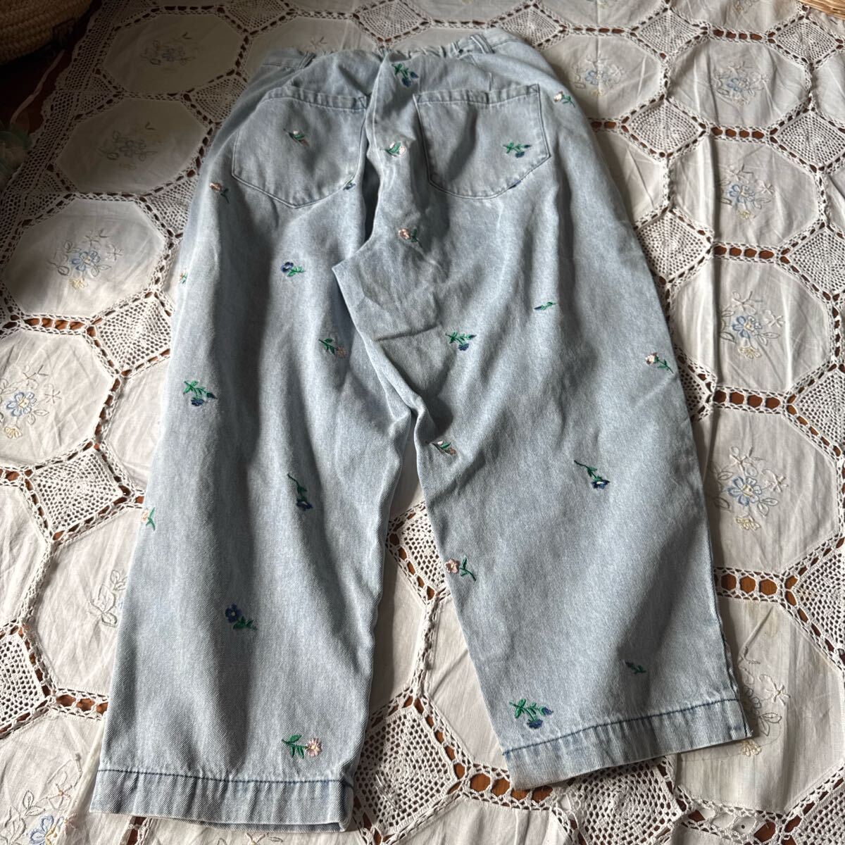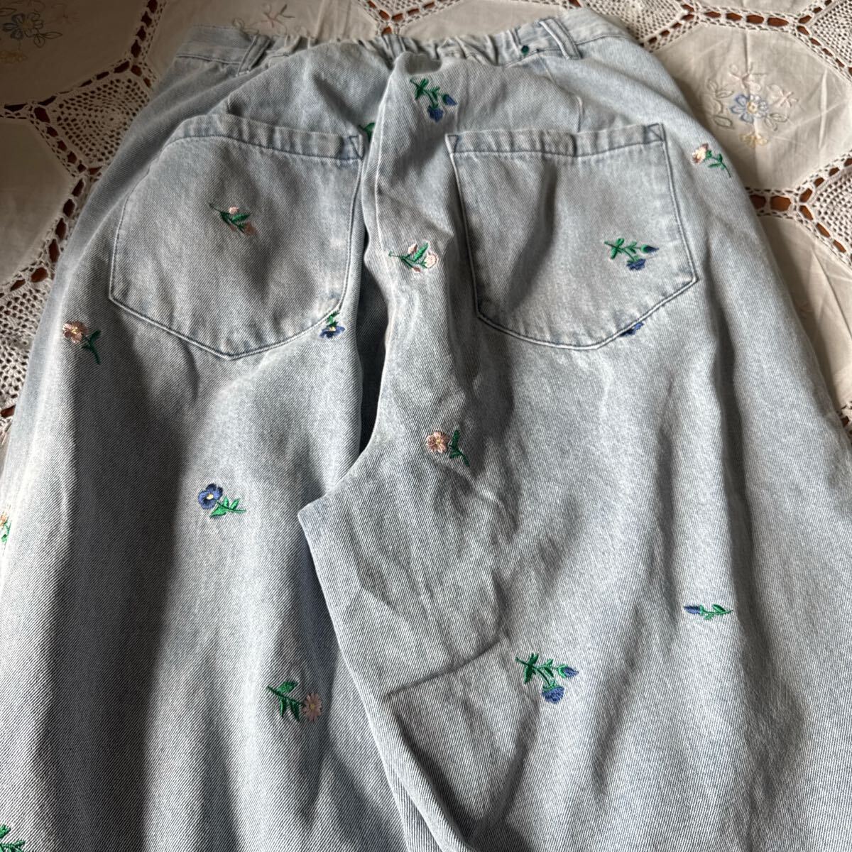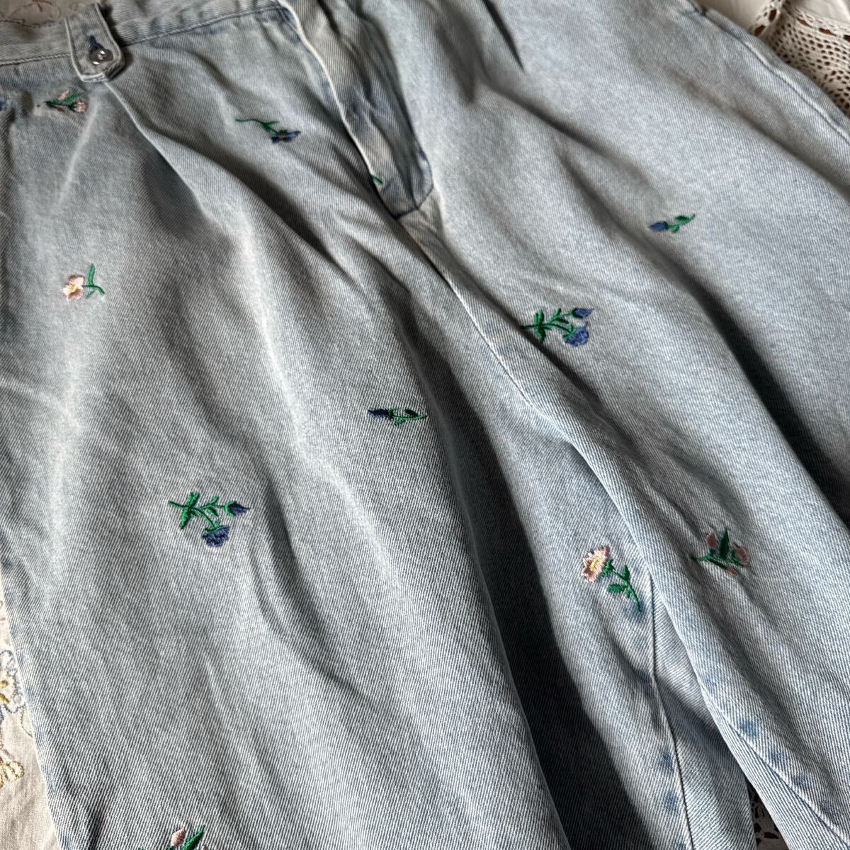 刺繍の花柄が施されたライトブルーデニムパンツ。