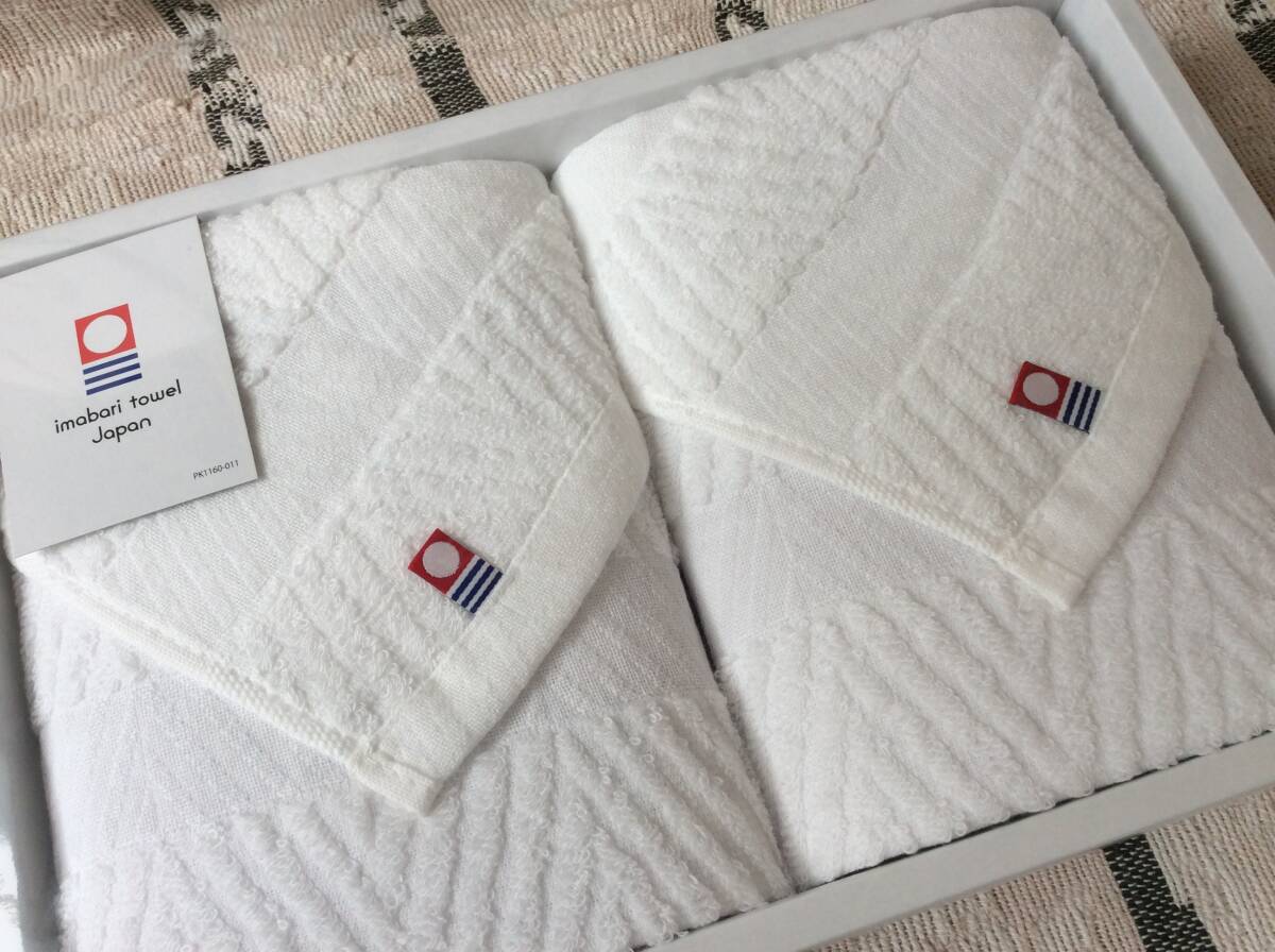 出品者よりひと言…未使用今治タオル2枚組のご案内です。単なる白いタオルでは無く、綾織のデザインが入っており、より立体的で高級感があります。今治特産のマークも付いているので、来客用にも良いと思います。もちろん、ちょっと贅沢にご自宅使いでも。