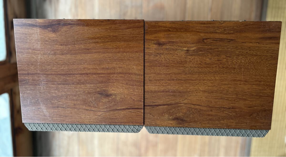 筐体設計:ユニット配置は左右対称で音場の定位を改善。角型木製バスレフダクトと分散共振構造により箱鳴りを抑制。外装はペカン調のリアルウッド風仕上げ、メッシュ状のサランネット付き。