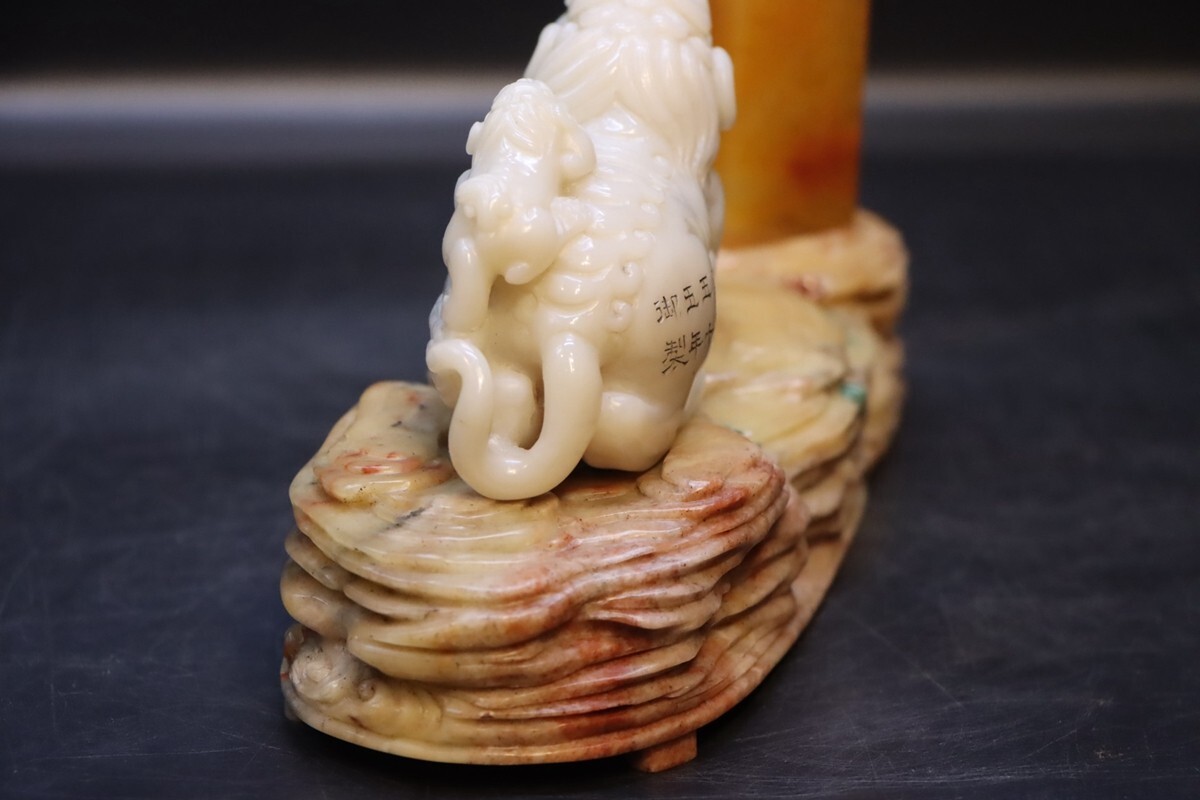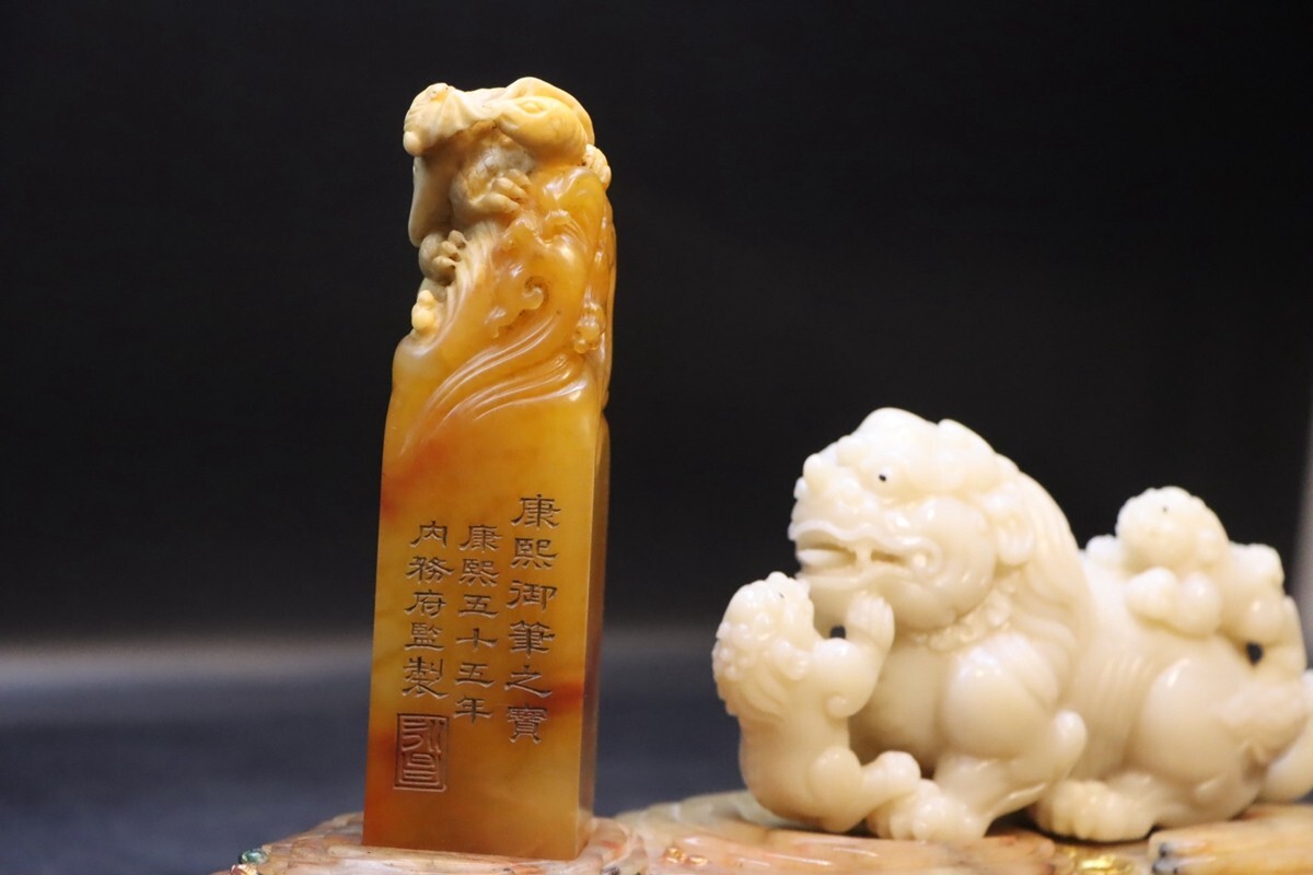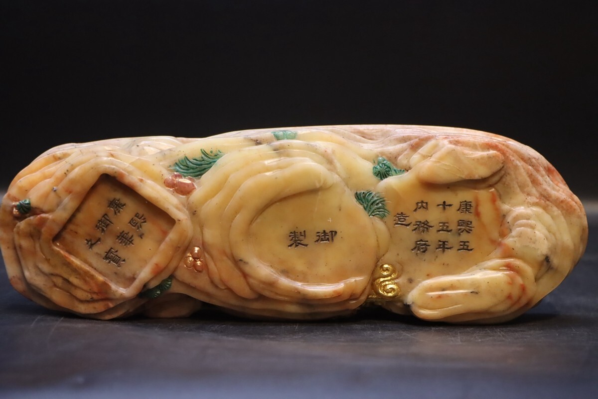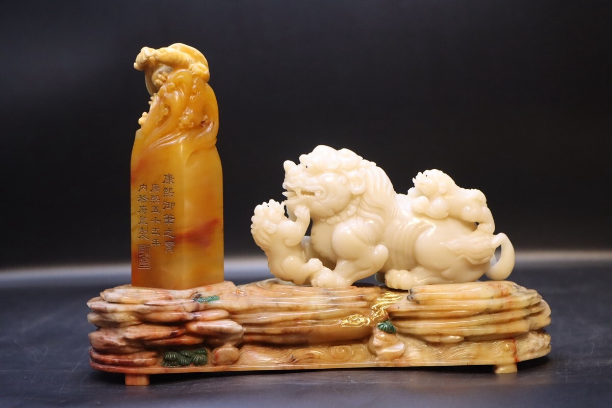 「清 康熙五十五年御製 老寿山石 田黄白田石彫り 福壽 対章」極細工 擺件 古賞物 中国古美術 旧蔵出