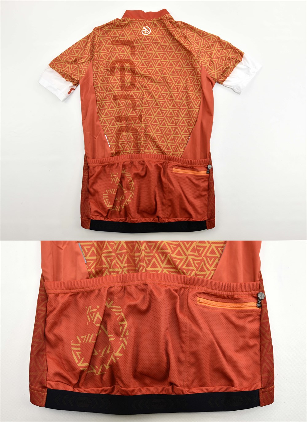 ・三角の文様が織りなす、和柄テイストなデザインが特徴で、背中のブランドロゴは浮き上がるような見せ方でさりげなく主張しています。