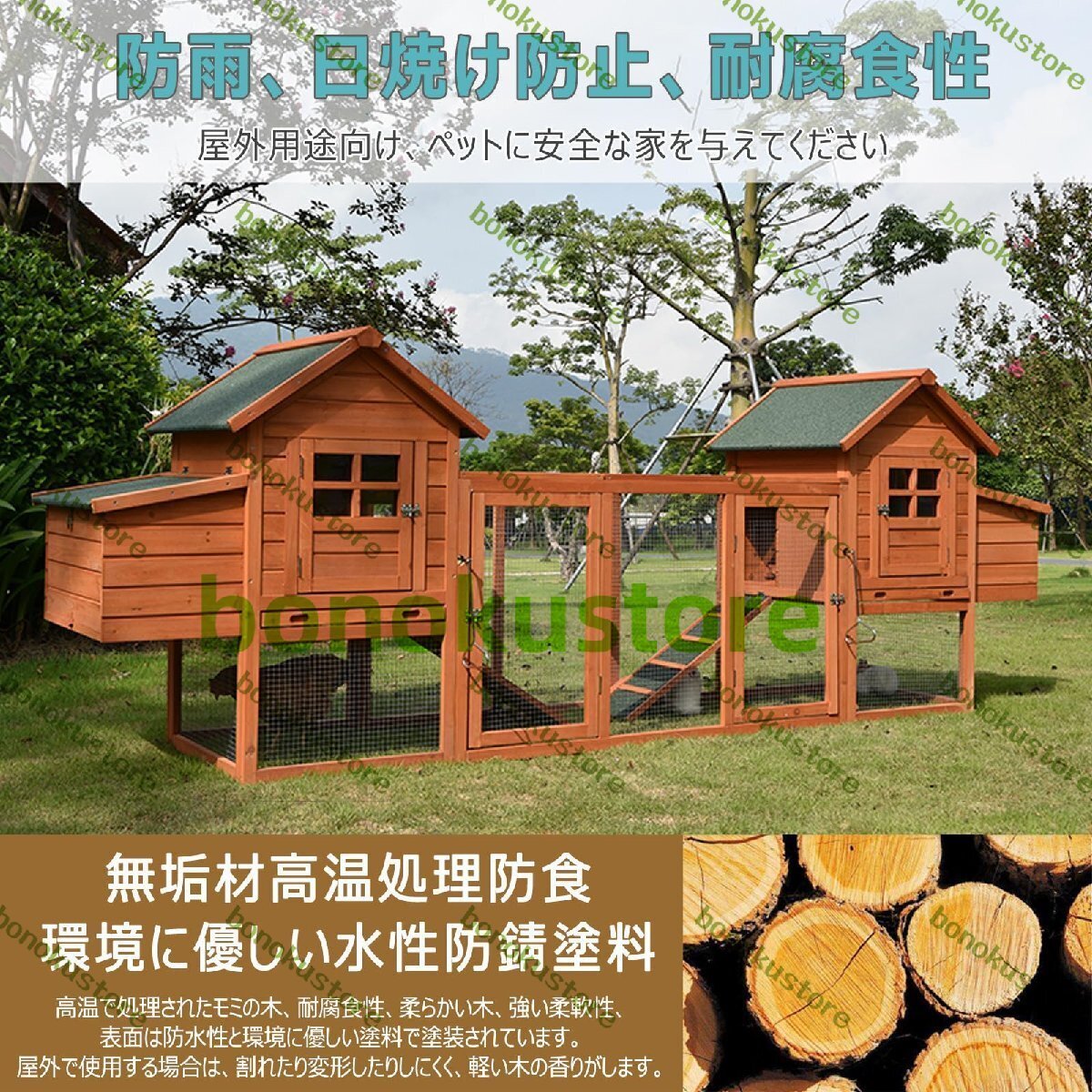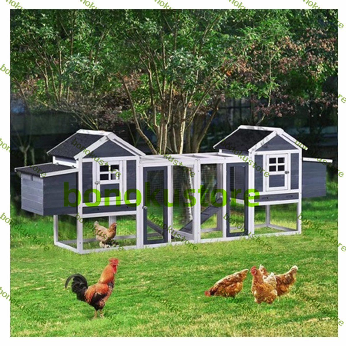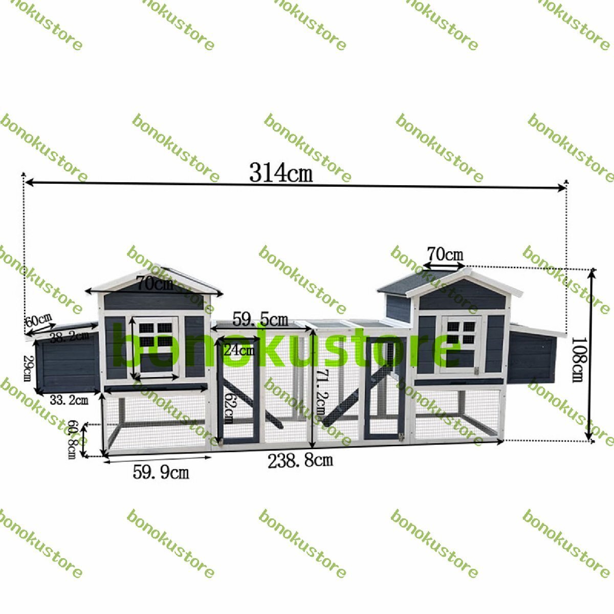 【広い居住空間鶏小屋】-頑丈で用途の広い超大型チキンコープ、メインハウスが2つあるチキンコープ、組み立て後、全体のサイズは314x70x108cmです。下部にあるランニングケージの大きなアクティビティスペースのデザインは、鶏、ウサギ、アヒル、その他の小動物に非常に適しており、6?8羽の鶏を収容できます。鶏小屋は、パティオ、庭、そしてあなたの家の玄関先に配置するのに理想的です、それはあなたのペットにとって最良の選択です。