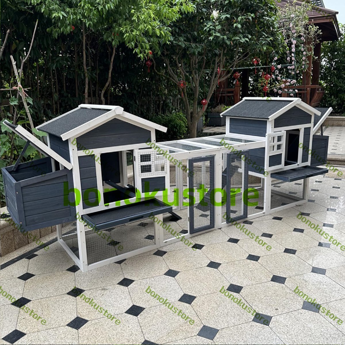 【広い居住空間鶏小屋】-頑丈で用途の広い超大型チキンコープ、メインハウスが2つあるチキンコープ、組み立て後、全体のサイズは314x70x108cmです。下部にあるランニングケージの大きなアクティビティスペースのデザインは、鶏、ウサギ、アヒル、その他の小動物に非常に適して