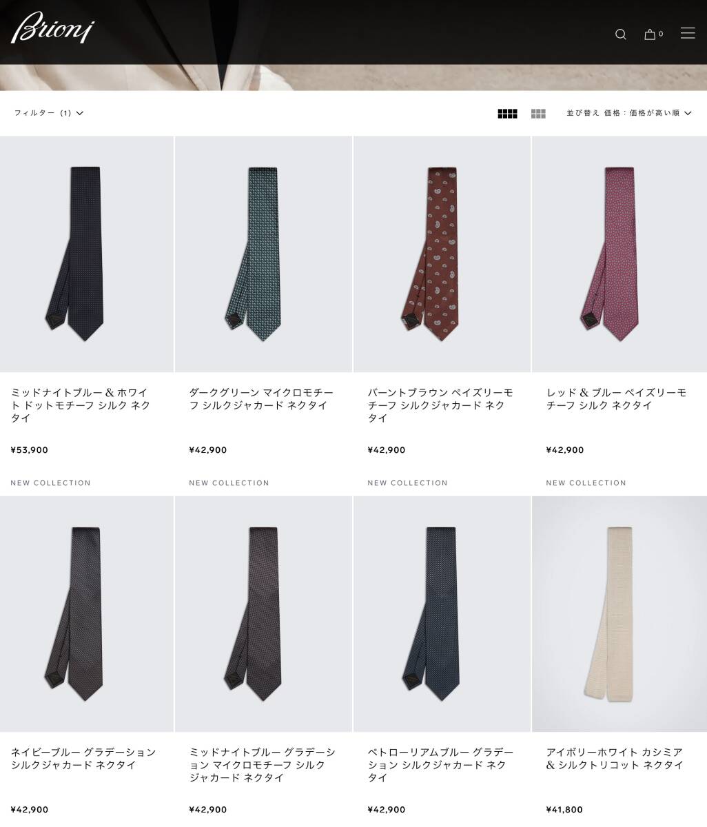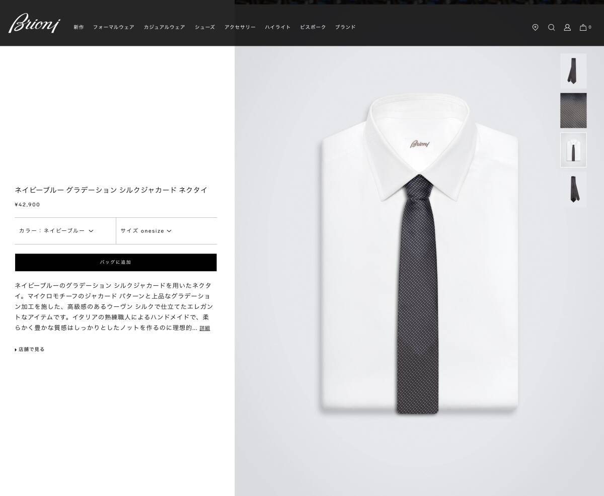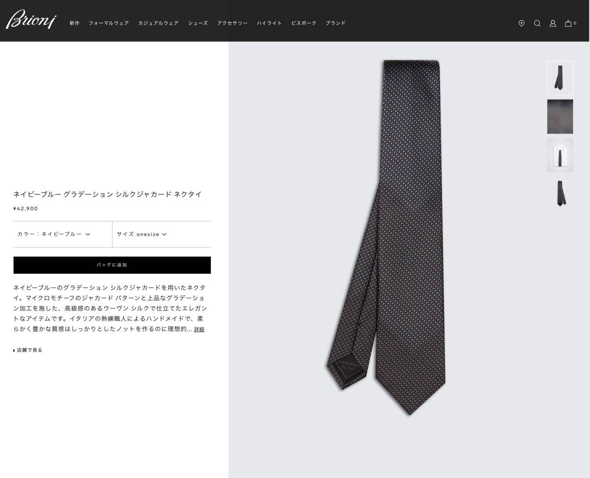ブリオーニの標準サイズであるモダンでエレガントな質感です。私も数十本持っているのですが、とにかく軽めで首がこりません。これまでの××フォールド、のようなものもよいのですが、近頃はそうしたブームも一段落し、クラシックな方向へとトレンドが変化しております。出品者も何着かは持っております。価格は定価4万0,700円を半額以下のスタートです。