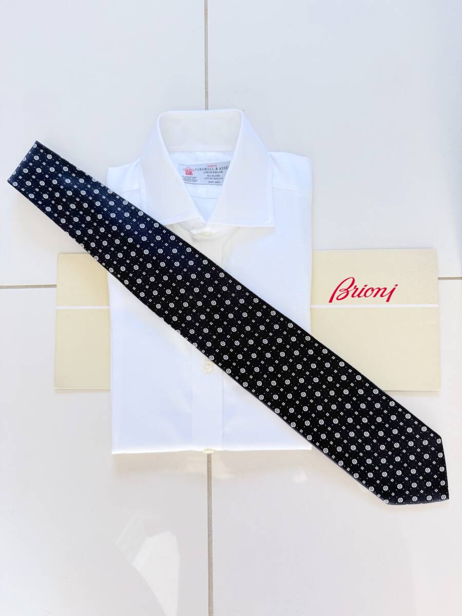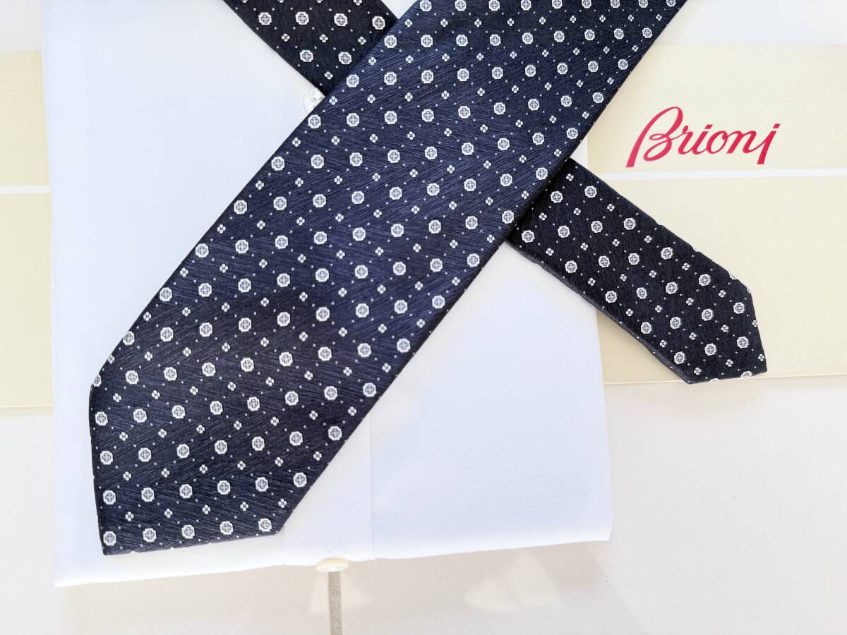 ブリオーニといえばネイビータイとバーガンディ、そしてグレーなどのソリットタイとレジメンですが、久しぶりにネイビータイが入荷です。しかも小紋という超エレガントなパターンの織り。探しておられた方も多いのではないでしょうか。2ヶ月ぶりの入荷、おまたせしました。これぞブリオーニというザ・タイです。