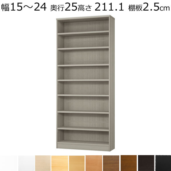 【特徴】幅15~70cm(棚板厚み1.7cm)(棚板厚み2.5cmは~幅90cm)まで1cm単位でオーダーメイド、本棚です。高さ49・60・70・80・88・117・135・150・178・211cmの10サイズ、奥行きは19・25・31・40・46cmの5サイズ、カラーは12色。【本体外寸】幅15~24×奥行き25×高さ211.1cm(約)【棚板枚数】7枚【幅の内寸】全体の幅サイズから3.6cmを引いた寸法となります。※側板(縦の両脇の板)の厚みは2.5cm 棚は移動可能で穴から穴までの高さ(ピッチ)は3cm【色・主材】木目調ナチュラル・木目調ブラウン・つや消しアイボリーホワイト・つや消しブラック色など12色・プリント紙化粧繊維板【生産国 】JAPAN※お客様組み立て商品です。(組み立て家具です)【お詫び】北海道・沖縄・離島は別途送料がかかります。【井崎店長から一言】特別注文のため、ご注文後のお取り消しがお受けすることが出来ません。サイズの確認を十分にお願いいたします。す。
