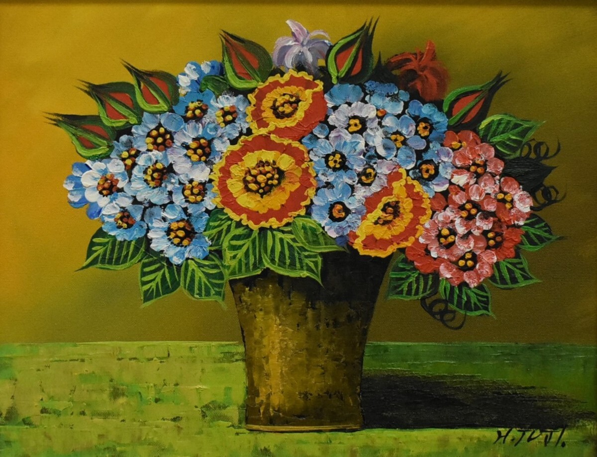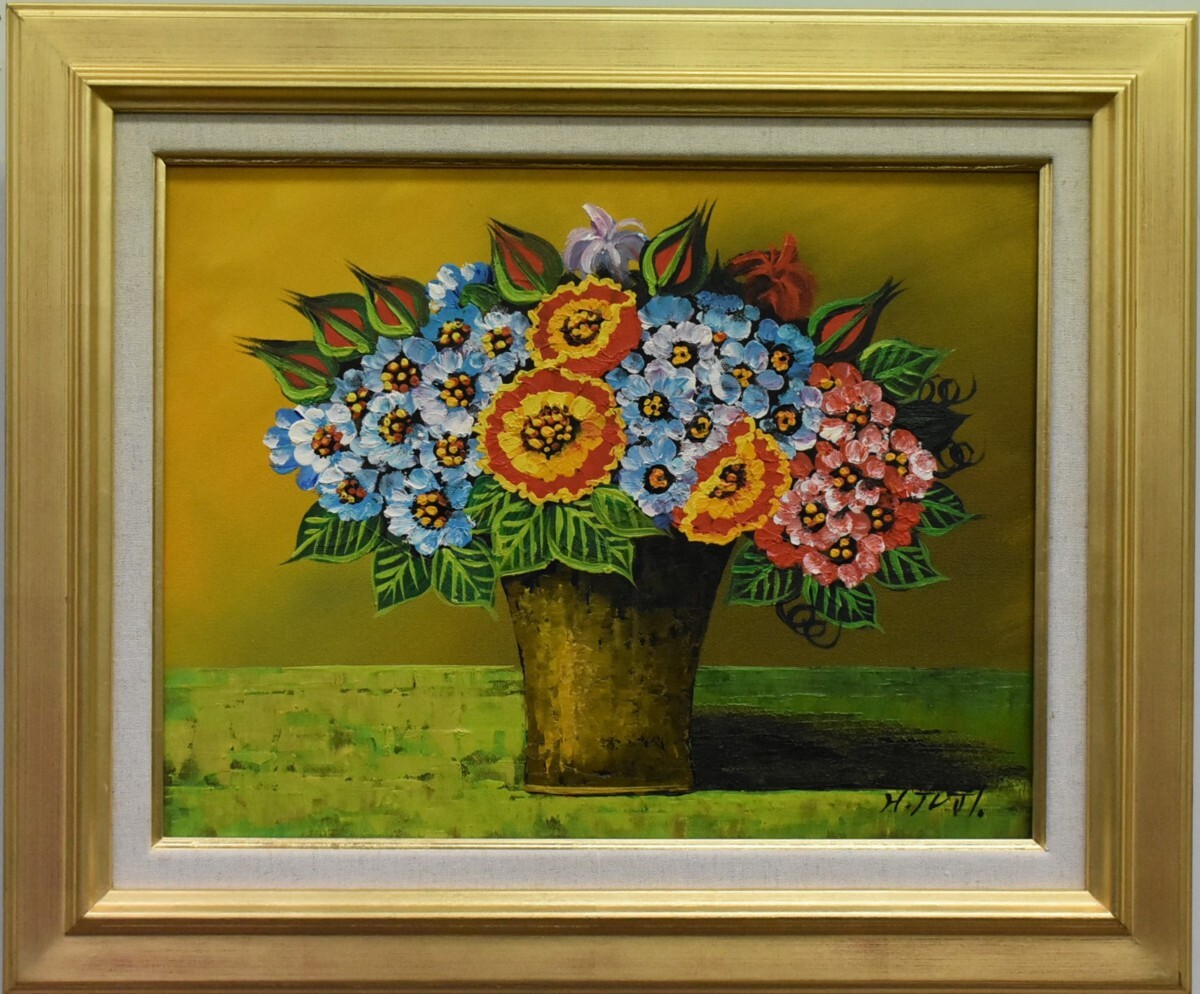 ![]() 辻寿志「花」洋画6F 鮮やかな色彩と力強いタッチで描かれた花々が、画面いっぱいに咲き誇ります。赤・青・黄の調和が生み出す華やかさは、見る者の気持ちを一瞬で明るくし、インテリアのアクセントとしても映える存在感です。 |