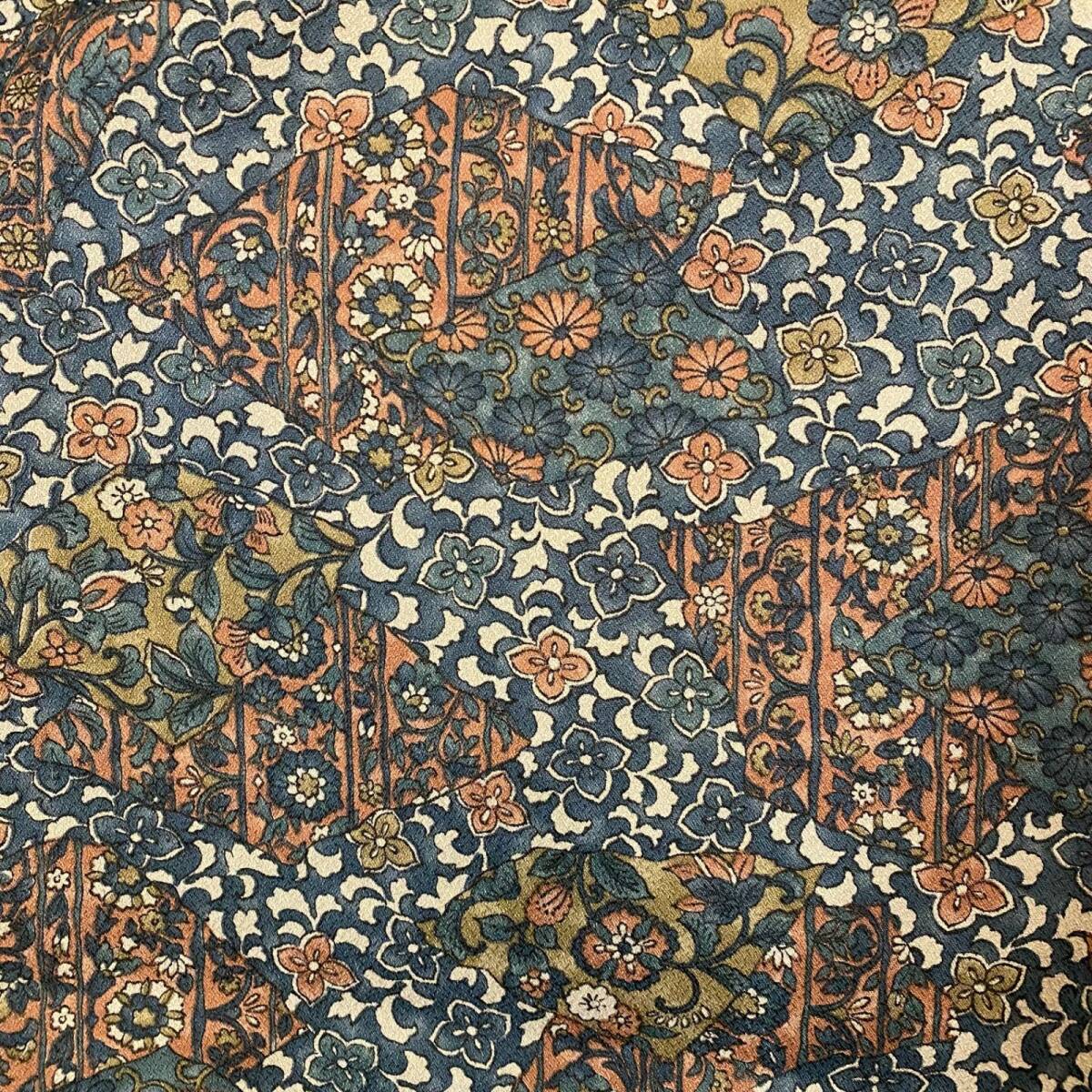 深く静かな湖底を思わせるピーコックグリーンに、唐草と小花をびっしり重ねた“和×アラベスク”の総柄小紋。褪せた朱や藍、オリーブを効かせたモザイク調のプリントがヴィンテージタペストリーのように浮かび、動くたび奥行きのある陰影を演出します。