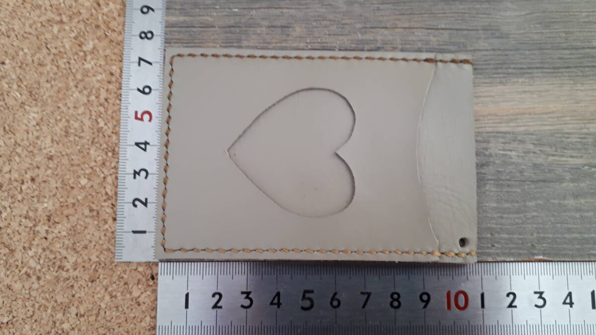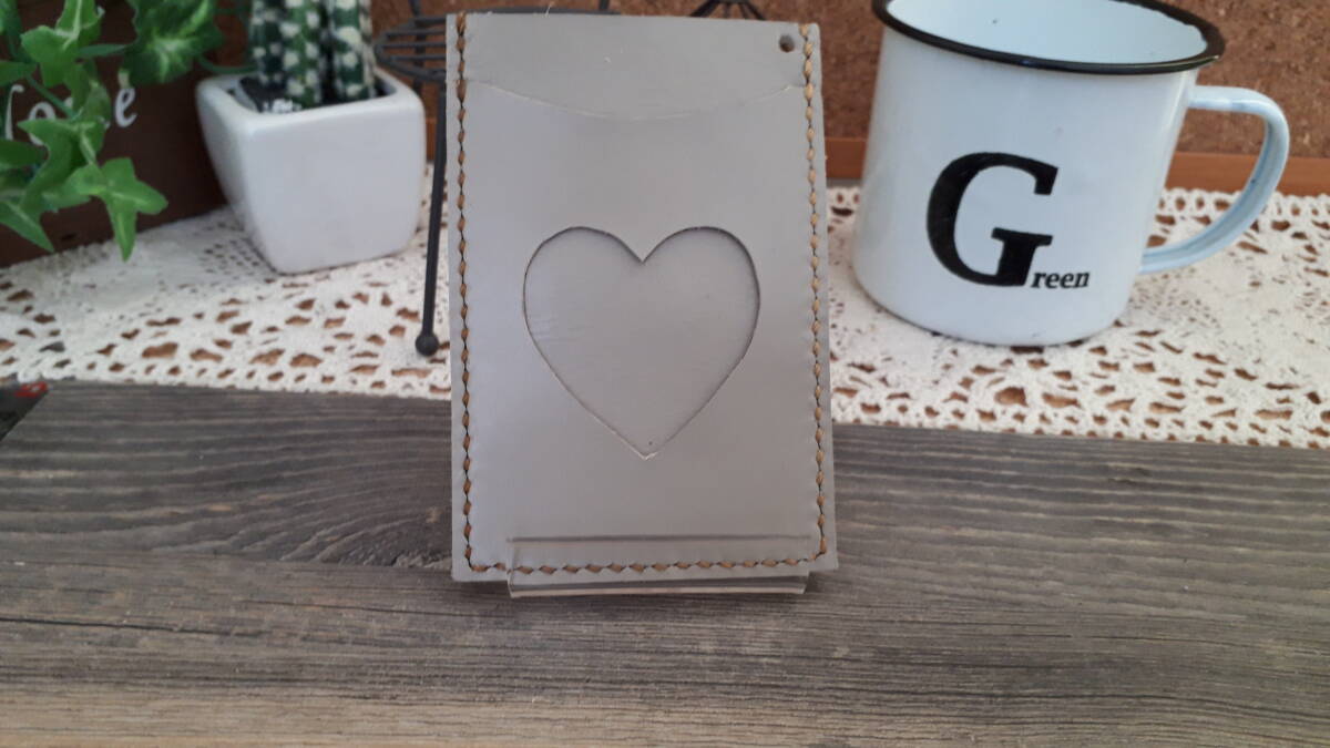 送料込)パスケース*ハート型 牛革 グレージュ色/ハンドメイドレザー