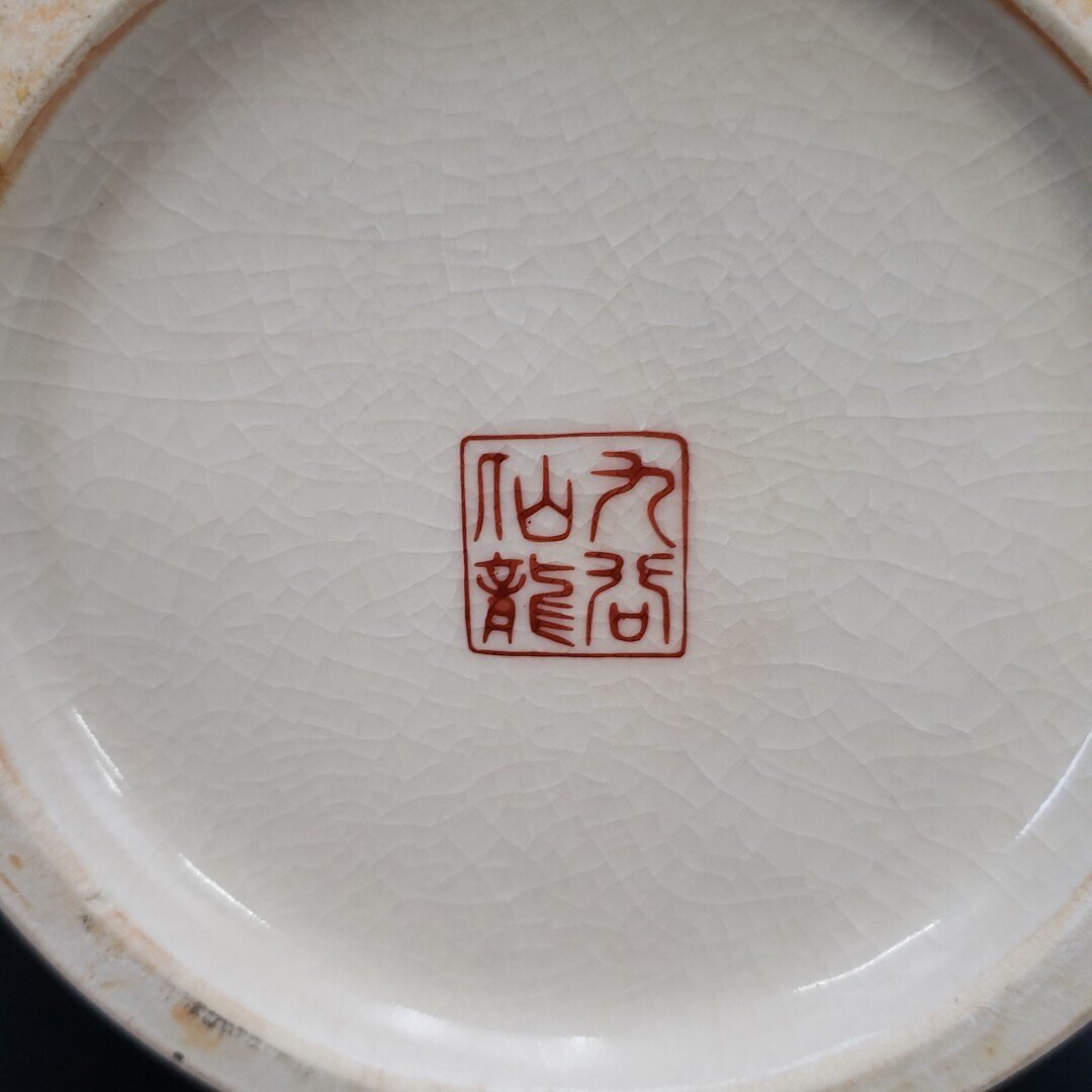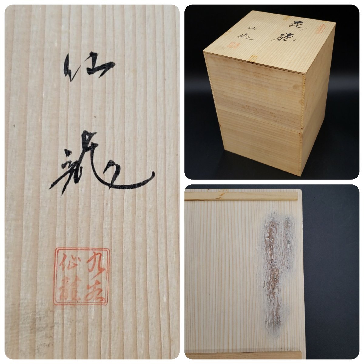 九谷仙龍作の花器です。経年による汚れ、擦れがあります。内部は未確認です。金彩の一部に変色があります。箱に記念品の印字を消した跡があります。