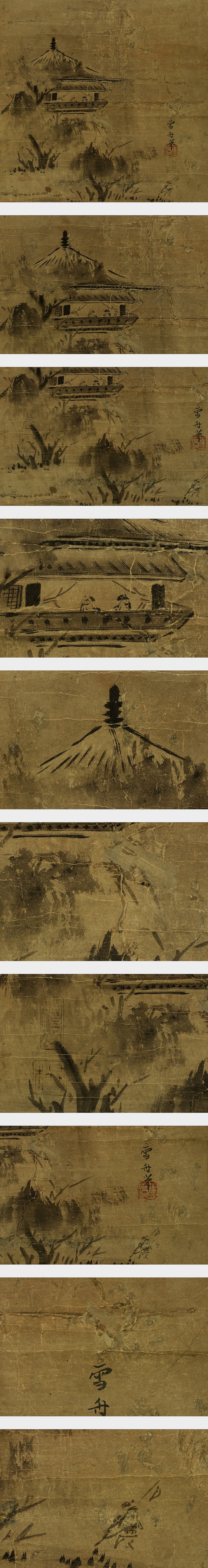 雪舟 せっしゅう(1420-1506) 室町後期の画僧。備中の人。諱は等楊。京都の相国寺に入り、画技を周文に学んだ。 山口に画房、雲谷庵を開設。渡明を挟んで宋元画を広く学び、のち大分に天開図画楼を開設。 自然に対する深い観照のもとに個性豊かな水墨山水画様式を完成し、後世に多大な影響を与えた。 本紙は、染み、汚れ、強い折れ、皺、破れ、虫食、剥がれ、経年によるヤケ、擦れ、 修復痕、時代感があります。 表装は、染み、汚れ、折れ、皺、軸先に傷みがあります。 【サイズ】 作品 横約37cm×縦約90.5cm 表装 横約49cm×縦約173cm |