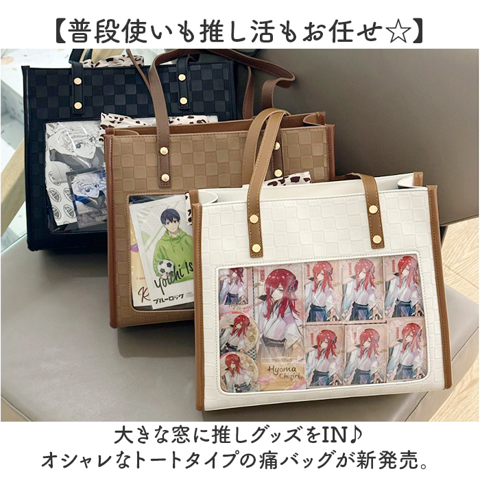 商品説明 | ・・【普段使いも推し活もお任せ☆】 ・大きな窓に推しグッズをIN♪オシャレなトートタイプの痛バッグが新発売。 ・【推しと一緒にお出かけ】 ・クリア窓にはバッジやアクリルスタンドなどの推しグッズを入れてデコレーションが可能◎ ・【バッグを傷つけないプレート】 ・バッジを刺せる専用のメッシュプレート付き。バッグを傷つけないのも嬉しいポイント。 ・【普段使いもしやすい見た目】 ・くるっと裏にするだけでシンプルな見た目のバッグに♪普段使いにもピッタリ☆ ・【長めのハンドルで肩掛けも】 ・バッグのハンドルは長めに設計し、アウターの上からでも肩掛けがしやすい。 ・【ちょうどよい収納力が魅力】 ・コンパクトに見えて、しっかり収納できるサイズ感。ペットボトル、ペンライトも入っちゃう。 ・【付属のリボンで可愛さUP】 ・付属のリボンを取付ければさらに可愛さが上がるデザイン♪ ・【便利な外ポケットも】 ・すぐに取り出したいチケットなどを入れるのに便利な外ポケットも装備。 ・【ポケット仕様】 ・アウトポケット・・・オープンポケット×1 |